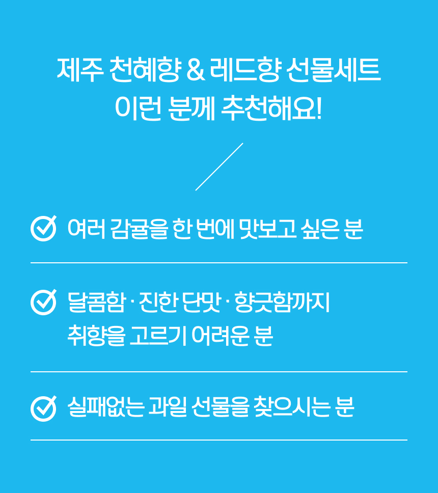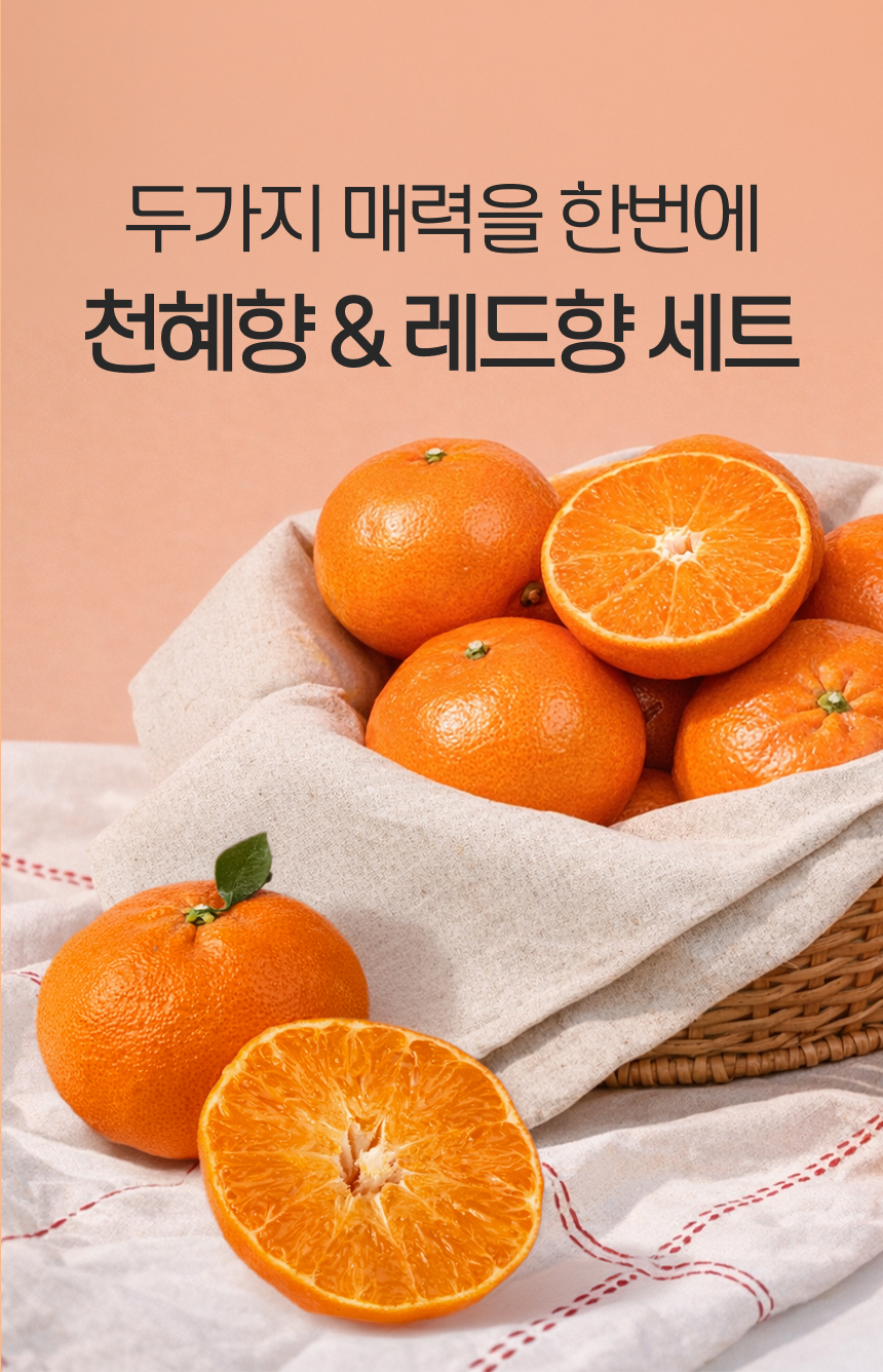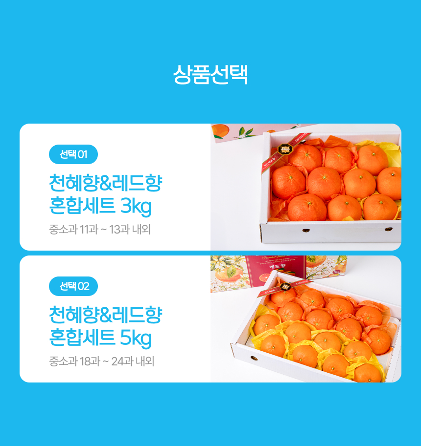 | 상품구성 | 레드향 천혜향 혼합 선물세트 3kg(8과~11과),레드향 천혜향 선물세트 5kg(12과~20과) |