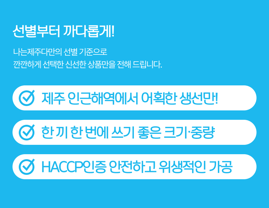 - 신선·냉장·냉동식품의 경우, 재판매가 불가능한 특성상 상품 발송 이후 취소·반품이 불가합니다. 단, 상품 하자(파손·변질 등)가 명확히 확인된 경우에 한해, 수령일로부터 48시간 이내 하자 상태를 확인되는 사진(2~3장 이상) 과 함께 홈페이지 환불 접수 혹은 나는 제주다 카카오톡 채널으로 접수하시면 됩니다.