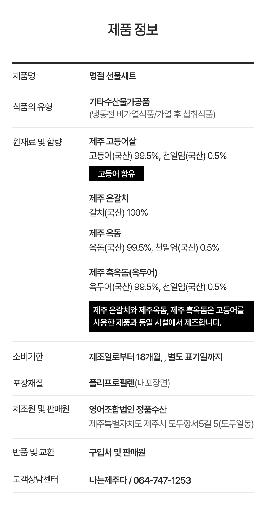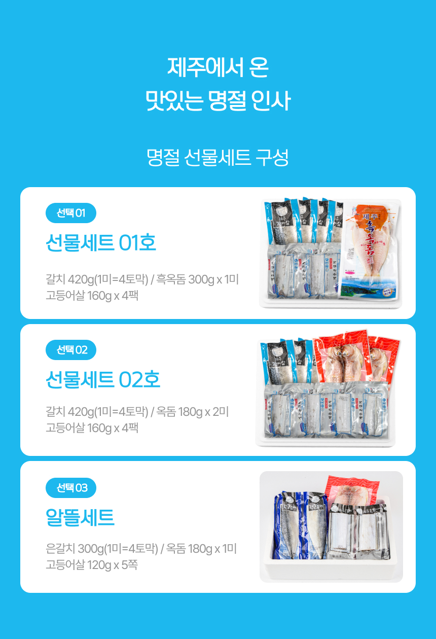 | 포장단위별 내용물의 용량(중량),수량,크기 | 설 알뜰세트 1 고등어살 120g 5쪽 은갈치 300g 1마리 옥돔 180g 1마리/설 선물세트 1 은갈치420g 1마리 흑옥돔300g 1마리 고등어 160g 4팩/설 선물세트 2 은갈치420g 1마리 옥돔180g 2마리 고등어 160g 4팩 |