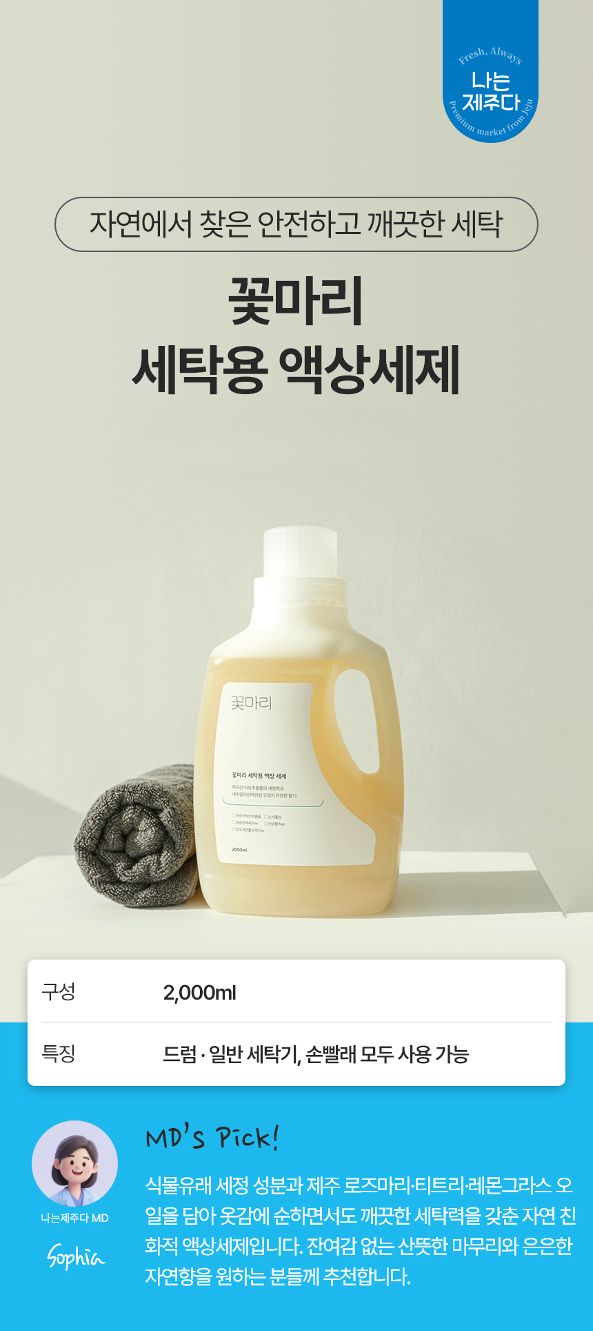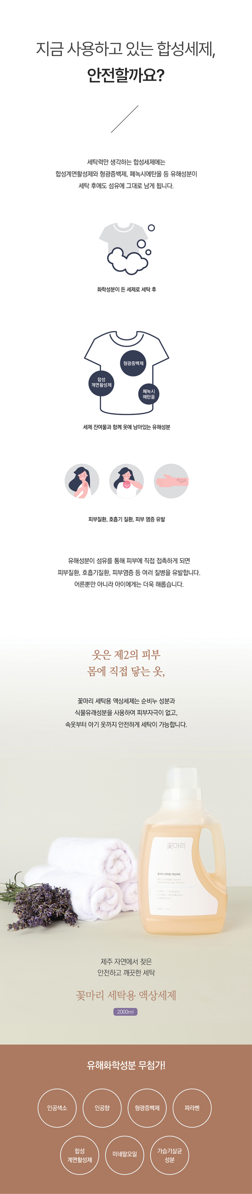 | 제품 주요 사양 | 액상세제(무형광증백제, 무색소, 무표백제, 무파라벤, 무인산염, 무PHMG, 무CMIT,MIT, 무방부제) |