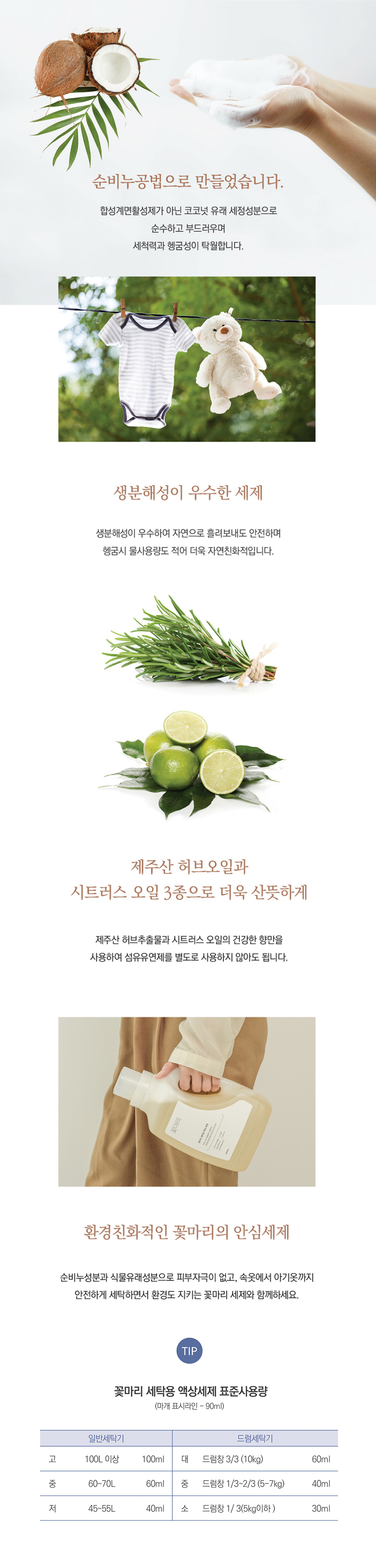 | 사용방법 | 드럼세탁기, 일반세탁기, 손빨래 모두 사용 가능합니다. 표준사용량 안내와 의류에 부착된 라벨을 참고하여 세탁해 주세요. 물이 잘 빠지는 의류는 단독 세탁해 주세요. 세탁의 종류, 세탁물의 오염정도, 세탁 양에 따라 사용량을 적절하게 가감해서 사용하세요. |
