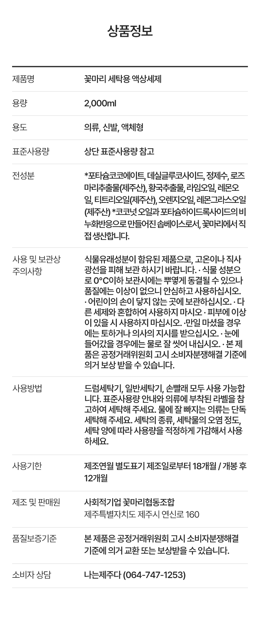 | 사용 시 주의사항 | 식물유래 성분이 함유된 제품으로, 고온이나 직사광선을 피해 보관 하시기 바랍니다. 식물 성분으로 0'C이하 보관시에는 뿌옇게 동결되 수 있으나 품질에는 이상이 없으니 안심하고 사용 하십시오. 어린이의 손이 닿지 않는 곳에 보관하십시오. 다른세제와 혼합하여 사용하지 마시고 용도 이외 사용하지 마십시오. 만일 마셨을 경우에는 토하거나 의사의 지시를 받으십시오. 눈에 들어갔을 경우에는 물로 잘 씻어 내십시오. |