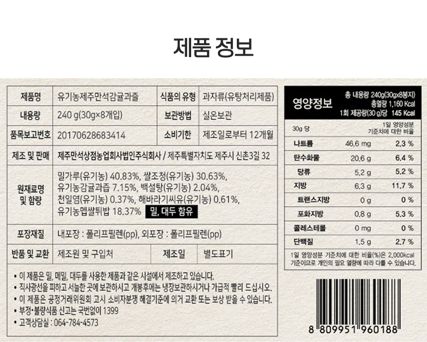 | 포장단위별 내용물의 용량(중량),수량 | 유기농 제주만석 쌀감귤과즐 240g(30g X 8개입) 2개입/1box |