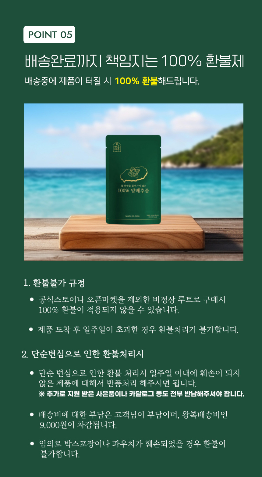 - 고객 귀책 사유(주소오류·연락두절·수령 지연·보관 부주의 등)로 인한 상품 변질·파손은 환불 대상이 아닙니다.