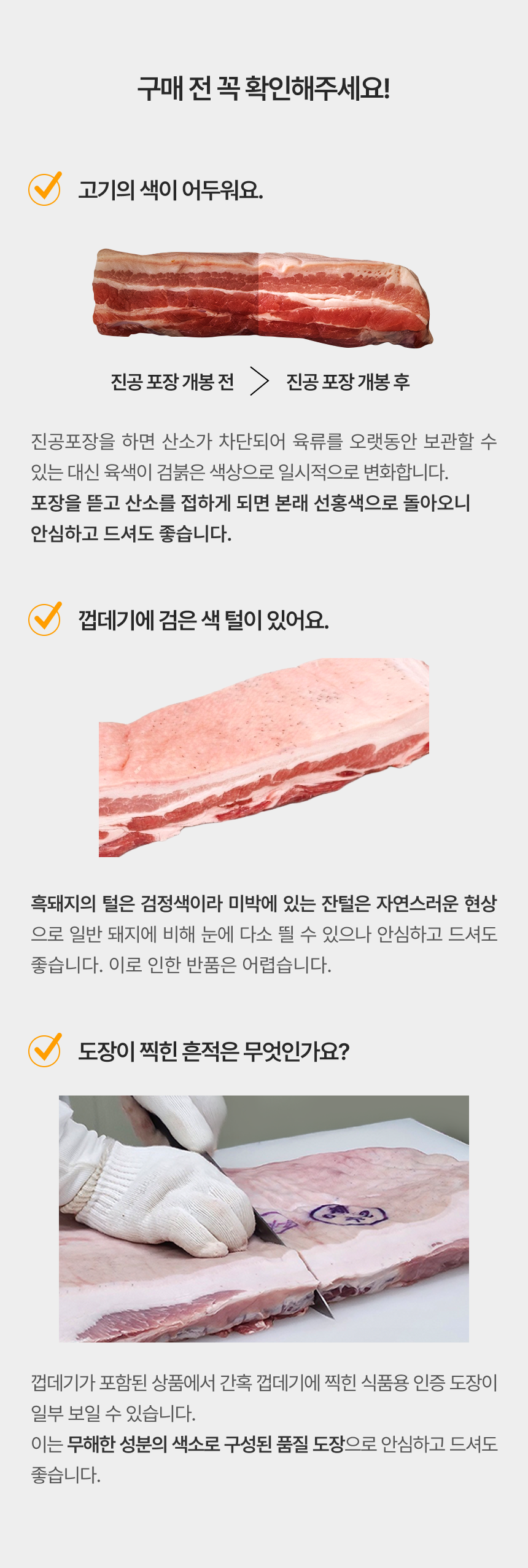 | 포장단위별 내용물의 용량(중량),수량,크기 | 구이용 1kg (두께1.2cm),숯불용 1kg (두께2.5-3cm),수육용 1kg (두께4-5cm) |