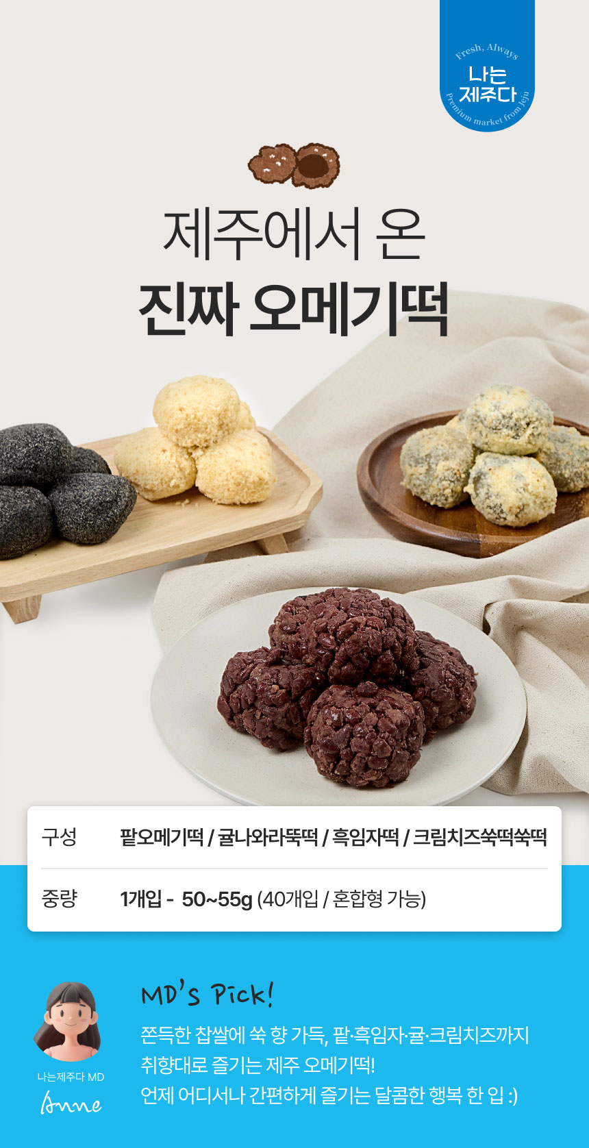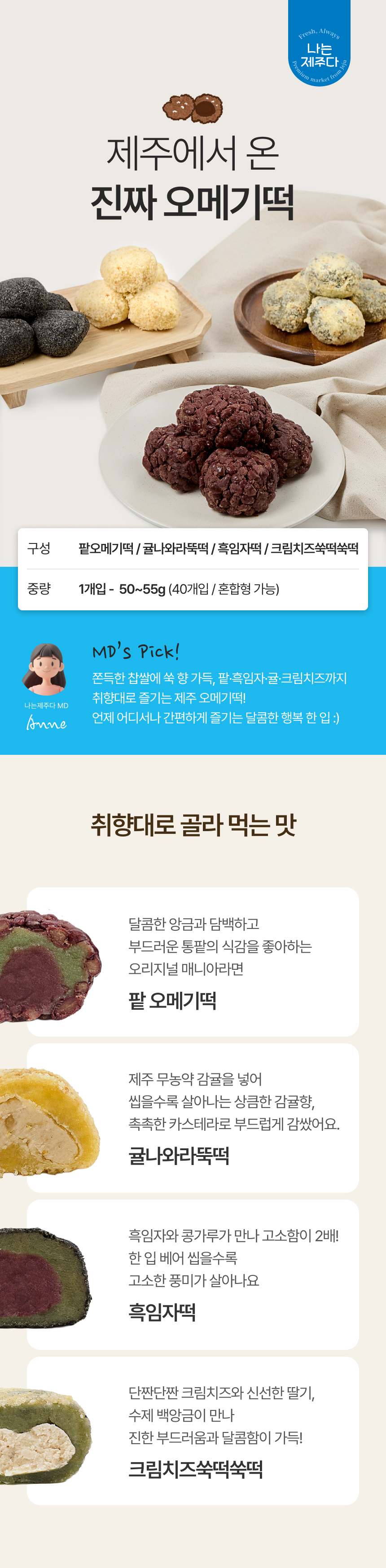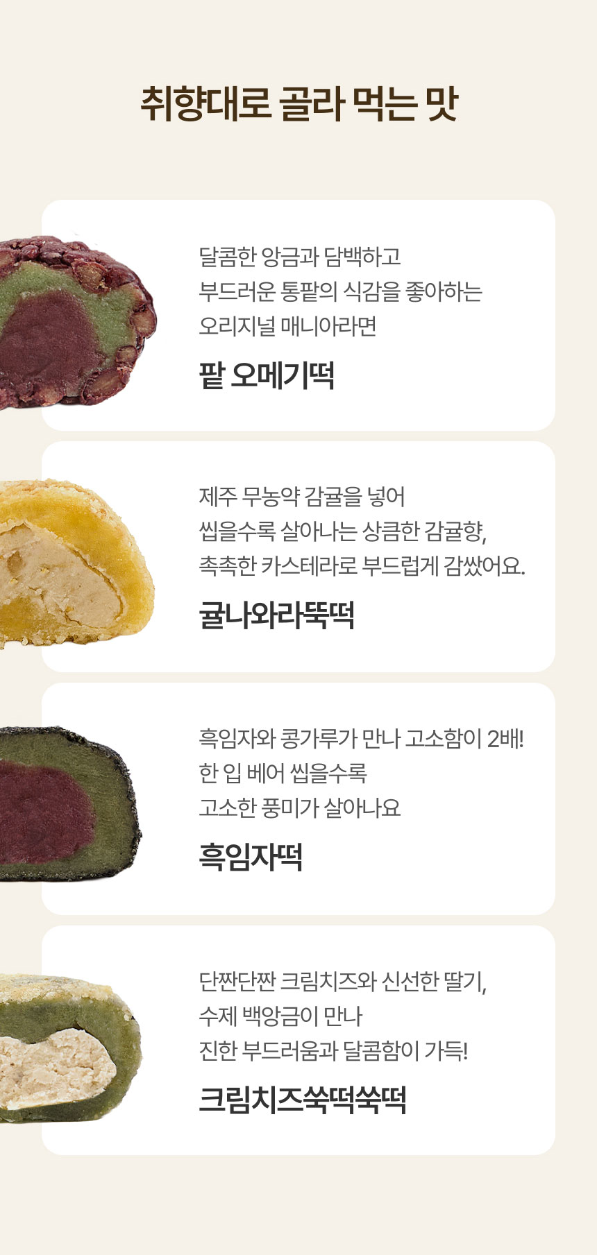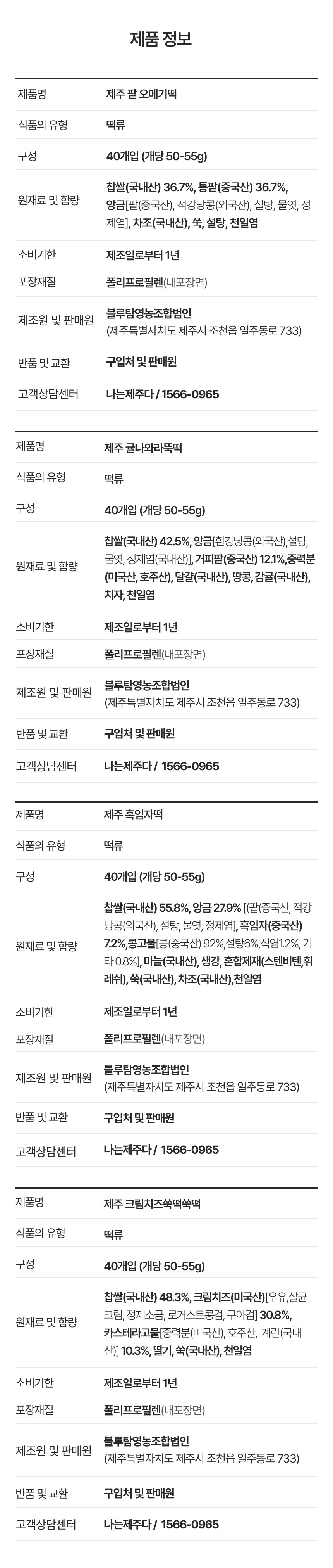 | 제품명 | 제주 팥오메기떡, 제주귤나와라뚝떡,제주흑임자떡,제주크림치즈쑥떡쑥떡 |