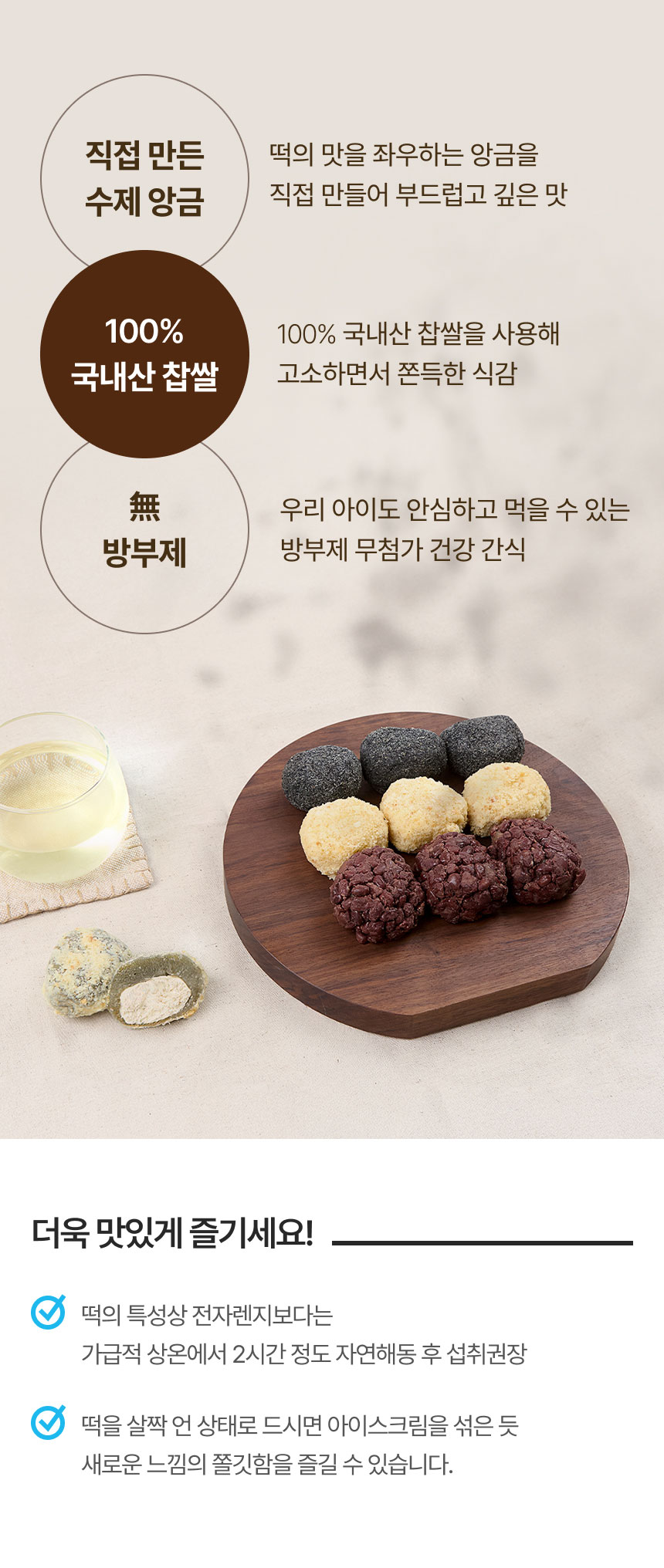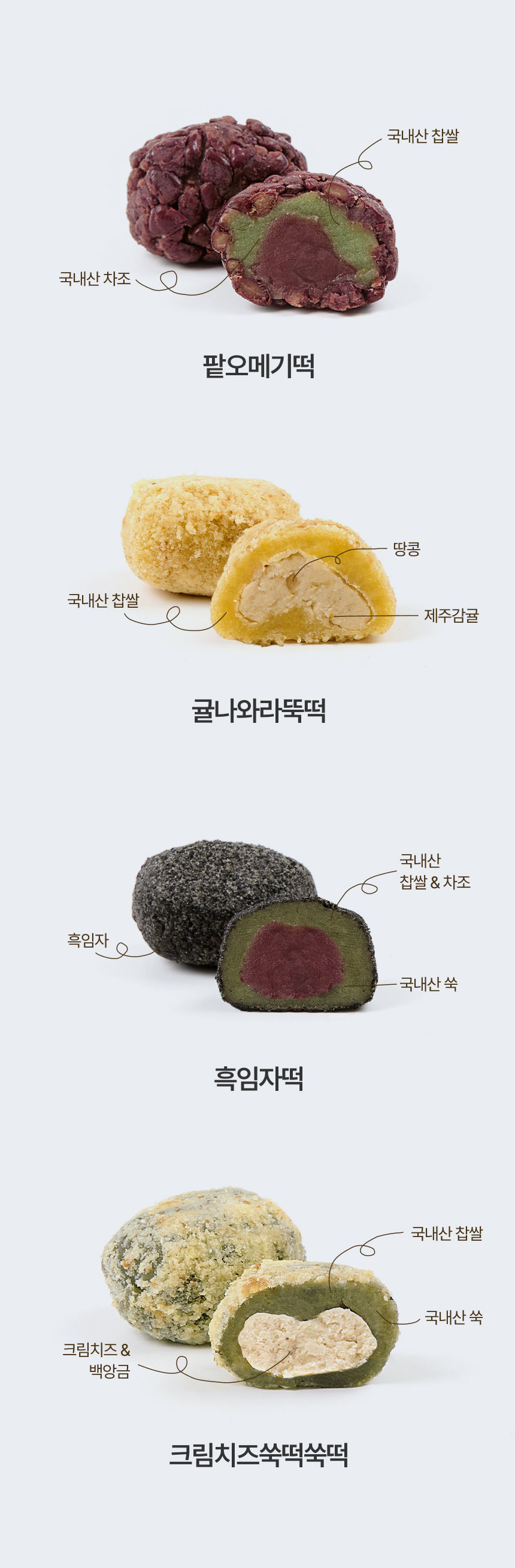 | 원재료명 및 함량 | 팥오메기떡: 찹쌀(국내산) 36.7%, 통팥(중국산) 36.7%, 앙금[팥(중국산), 적강낭콩(외국산), 설탕, 물엿, 정제염], 차조(국내산), 쑥, 설탕, 천일염 / 귤나와라뚝떡: 찹쌀(국내산) 42.5%, 앙금[흰강낭콩(외국산), 설탕, 물엿, 정제염(국내산)], 거피팥(중국산) 12.1%, 중력분(미국산, 호주산), 달걀(국내산), 땅콩, 감귤(국내산), 치자, 천일염 / 흑임자떡:찹쌀(국내산) 55.8%, 앙금 27.9%[(팥(중국산, 적강낭콩(외국산), 설탕, 물엿, 정제염)], 흑임자(중국산) 7.2%, 콩고물[콩(중국산) 92%, 설탕 6%, 식염 1.2%, 기타 0.8%], 마늘(국내산), 생강, 혼합제재(스텐비텐, 휘레쉬), 쑥(국내산), 차조(국내산), 천일염 / 크림치즈쑥떡쑥떡: 찹쌀(국내산) 48.3%, 크림치즈(미국산)[우유, 살균크림, 정제소금, 로커스트콩검, 구아검] 30.8%, 카스테라고물[중력분(미국산), 호주산, 계란(국내산)] 10.3%, 딸기, 쑥(국내산), 천일염 |