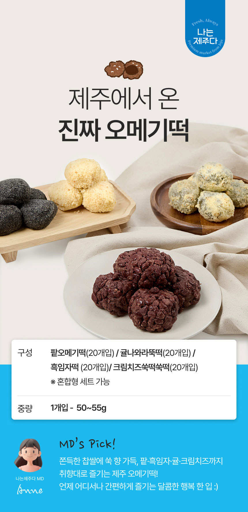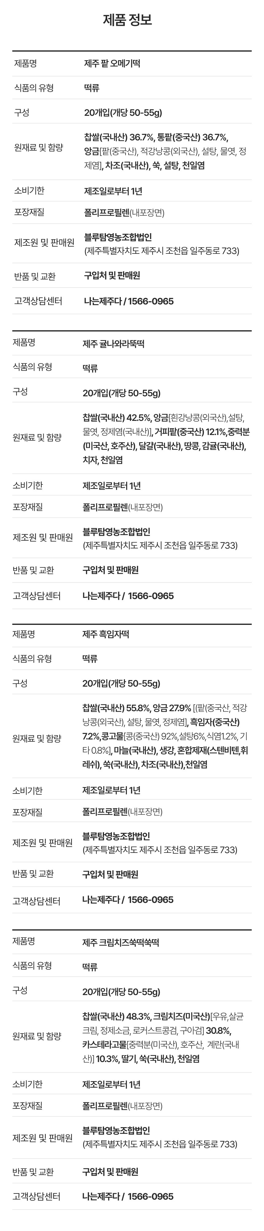 | 제품명 | 제주 팥오메기떡, 제주귤나와라뚝떡,제주흑임자떡,제주크림치즈쑥떡쑥떡 |