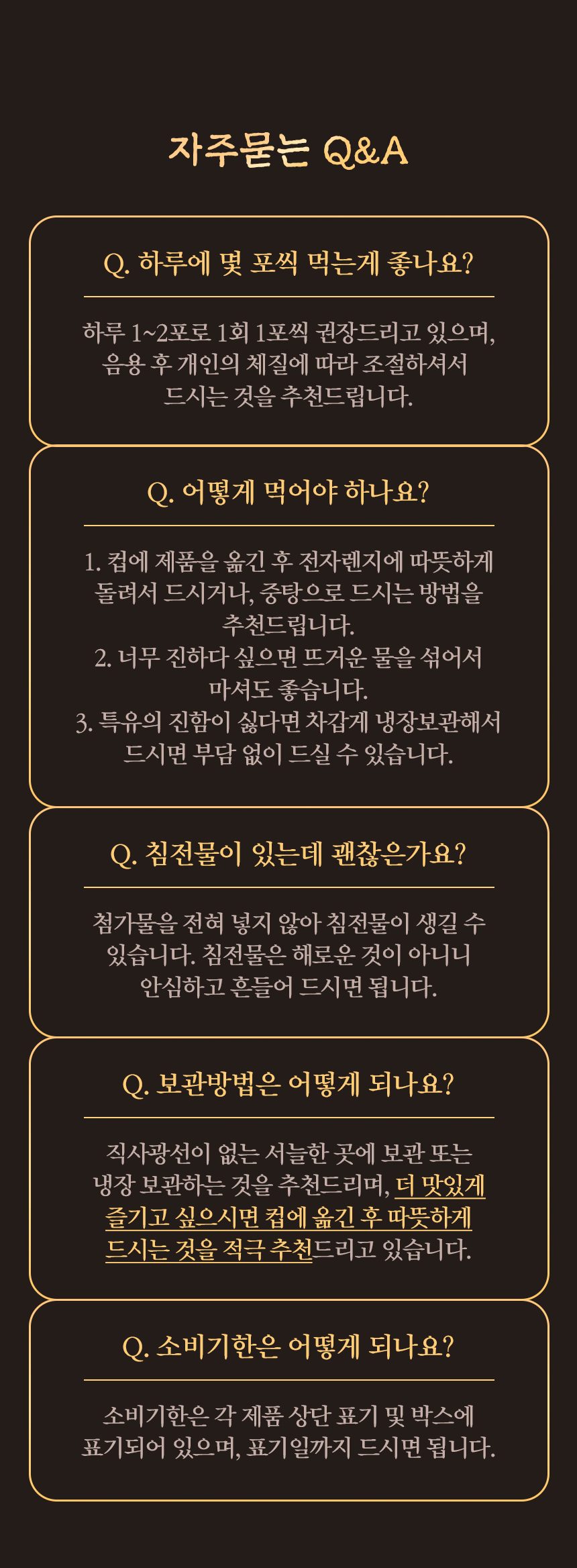 | 소비자안전을 위한 주의사항 | 직사광선이 없는 서늘한 곳에 보관 또는 냉장보관하는것을 추천드리며, 더 맛있게 즐기고 싶으시면 컵에 옮긴 후 따뜻하게 드시는 것을 적극 추천 드립니다. |