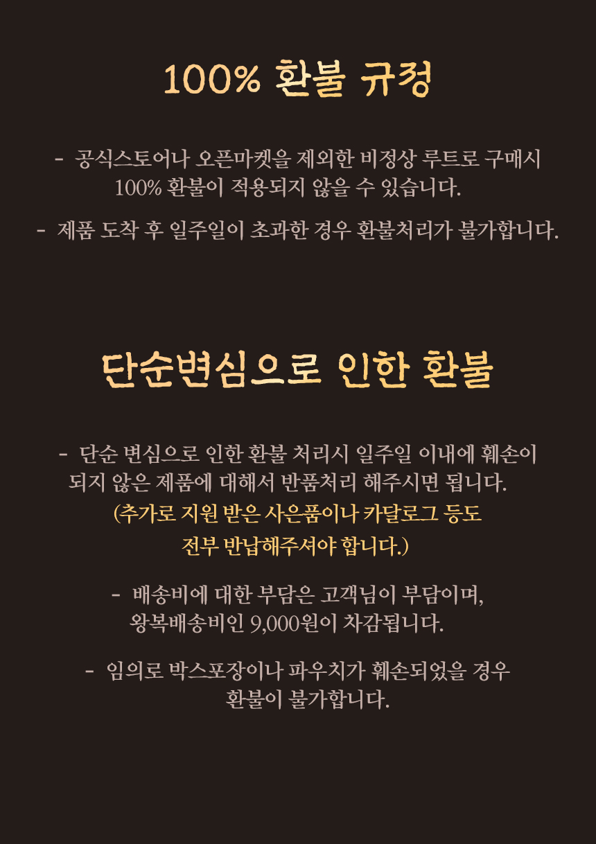 - 고객 귀책 사유(주소오류·연락두절·수령 지연·보관 부주의 등)로 인한 상품 변질·파손은 환불 대상이 아닙니다.