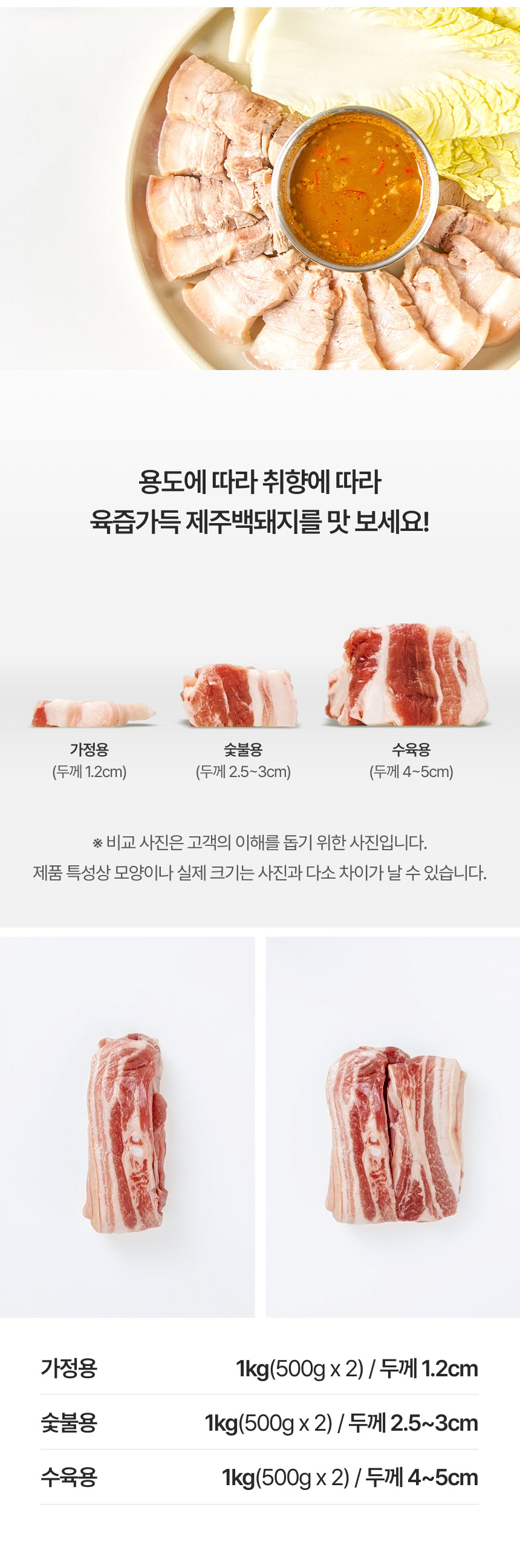 | 포장단위별 내용물의 용량(중량),수량,크기 | 구이용 500g X 2개 (두께1.2cm),숯불용 500g X 2개 (두께2.5-3cm),수육용 500g X 2개 (두께4-5cm) |