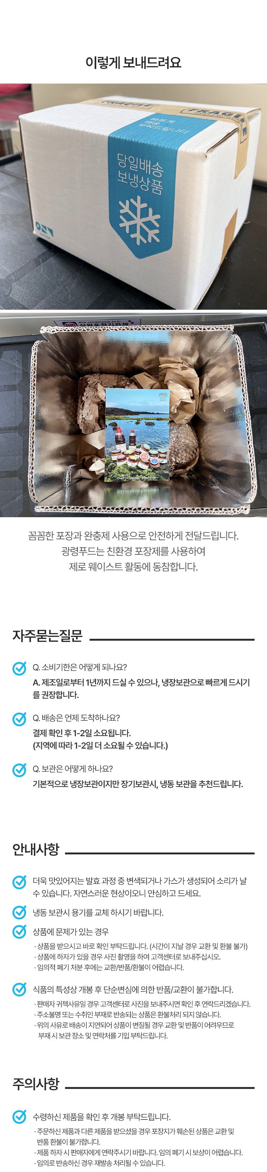 - 단순 변심, 개인적인 입맛 차이, 보관 부주의등 구매자 귀책 사유는 교환·반품 대상에 해당하지 않습니다.
