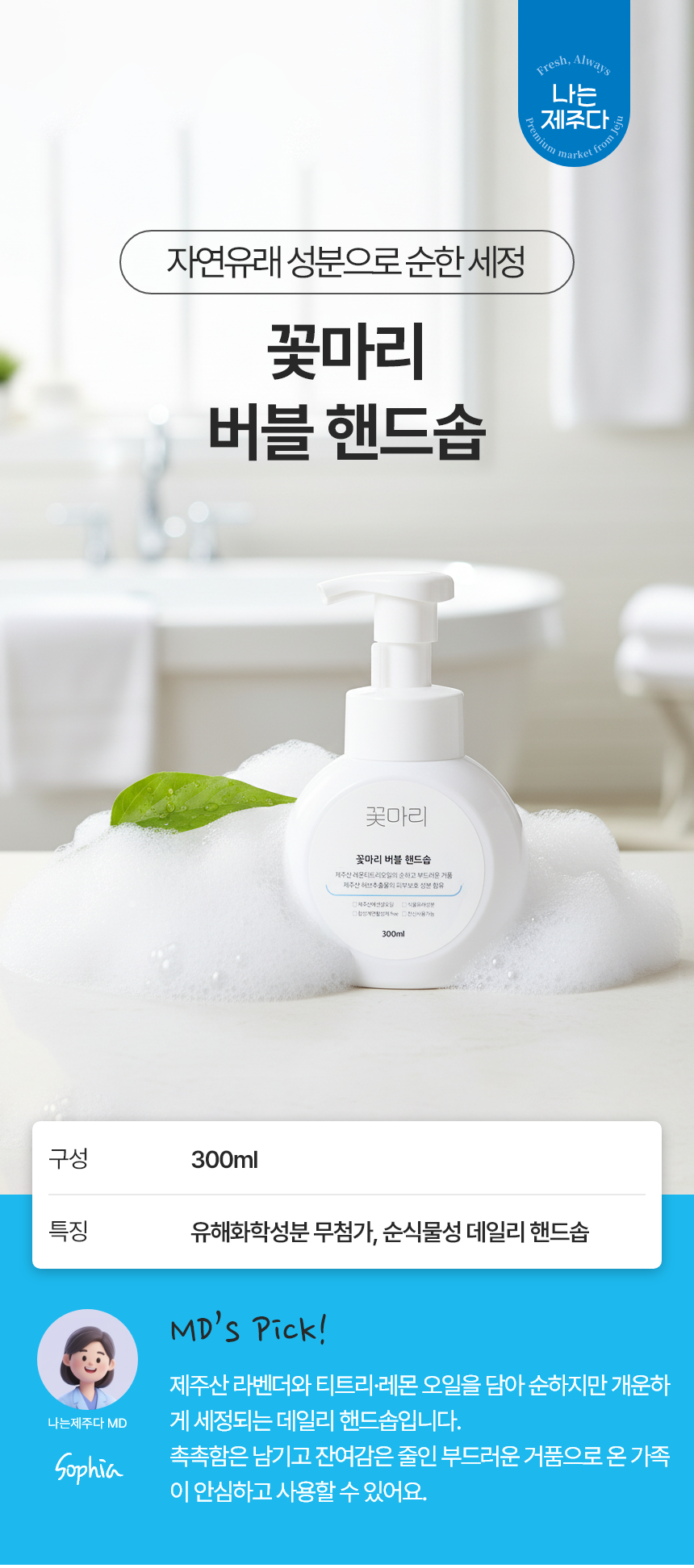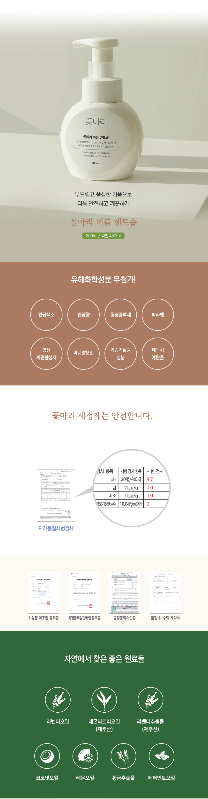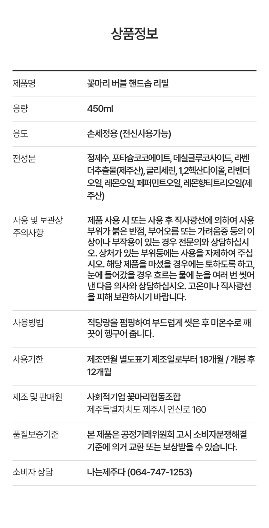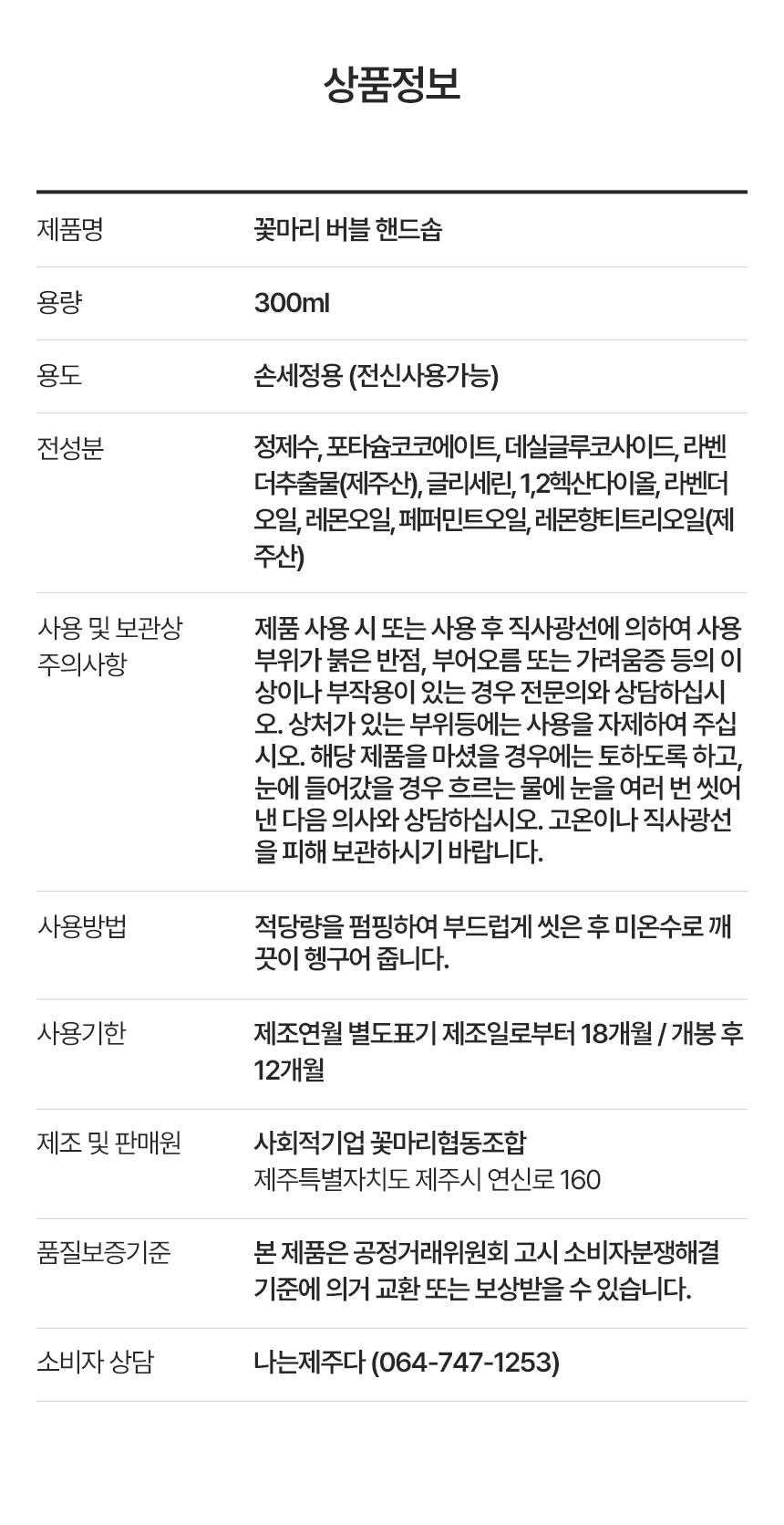 | 화장품법에 따라 기재, 표시하여야 하는 모든 성분 | 전성분: 정제수, 포타슘코코에이트, 데실클루코사이드, 라벤더추출물(제주산) 글리세린, 1.2헥산디올, 라벤더오일, 레몬오일. 페퍼민트오일, 레몬향티트리오일(제주산) |