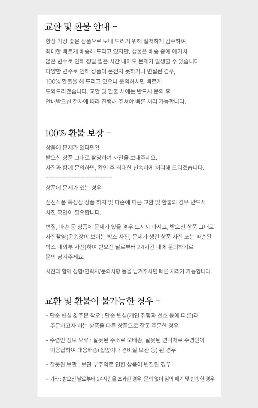 - 고객 귀책 사유(주소오류·연락두절·수령 지연·보관 부주의 등)로 인한 상품 변질·파손은 환불 대상이 아닙니다.