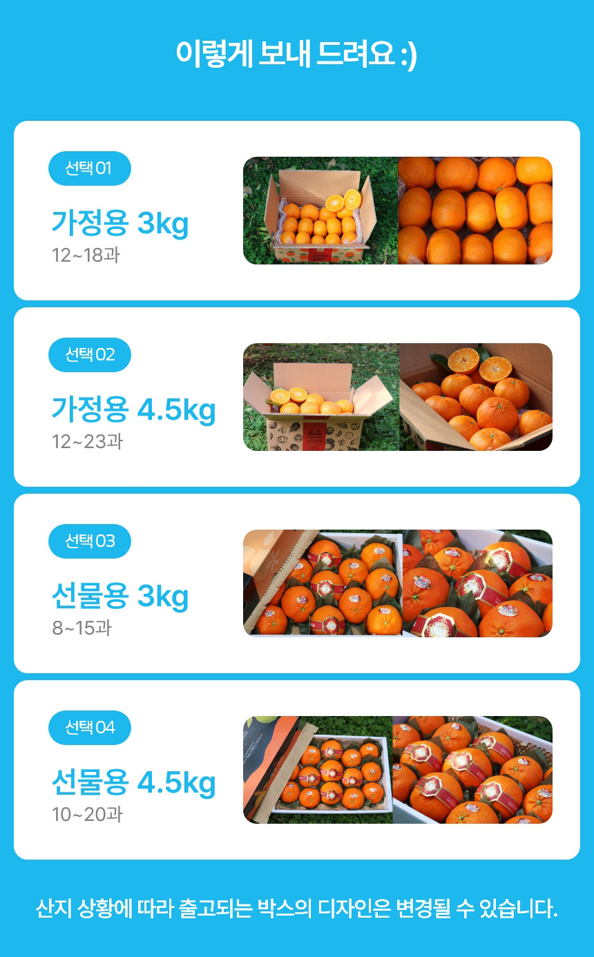 | 포장단위별 내용물의 용량(중량),수량,크기 | 원물기준-레드향 3kg선물용(8-15과),레드향 4.5kg선물용(10-20과)/1box |