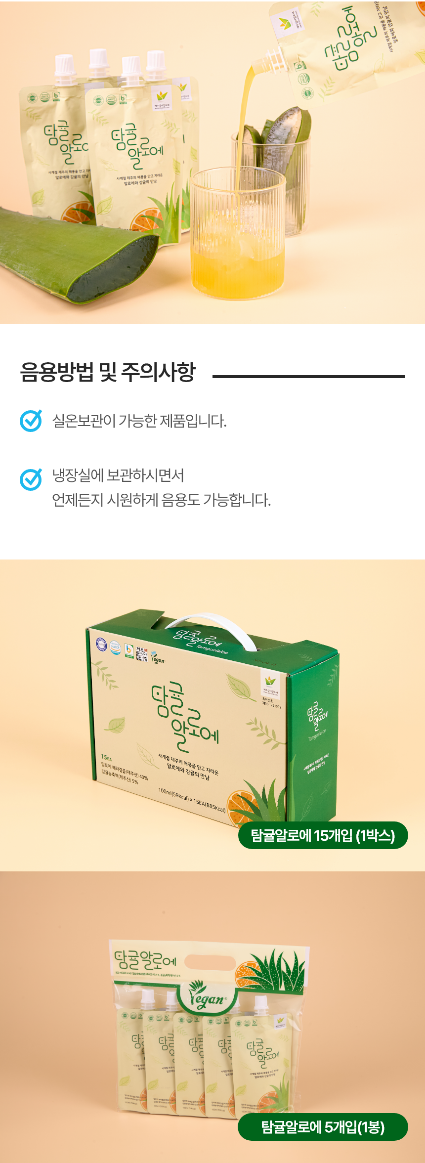 | 원재료명 및 함량 | 알로에 베라겔즙(국내산/제주특별자치도)40.4%, 감귤농축액(국내산/제주특별자치도)5%, 이소말토올리고당, 한천, 구연산, 비타민C, 효소처리스테비아, 정제수 |