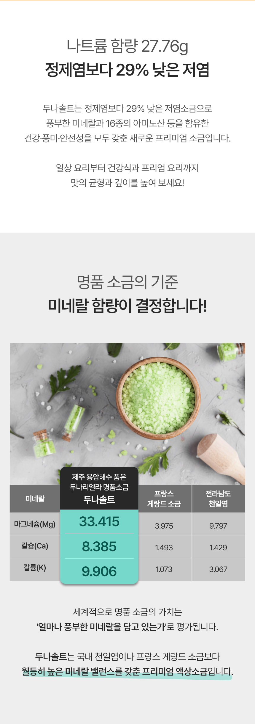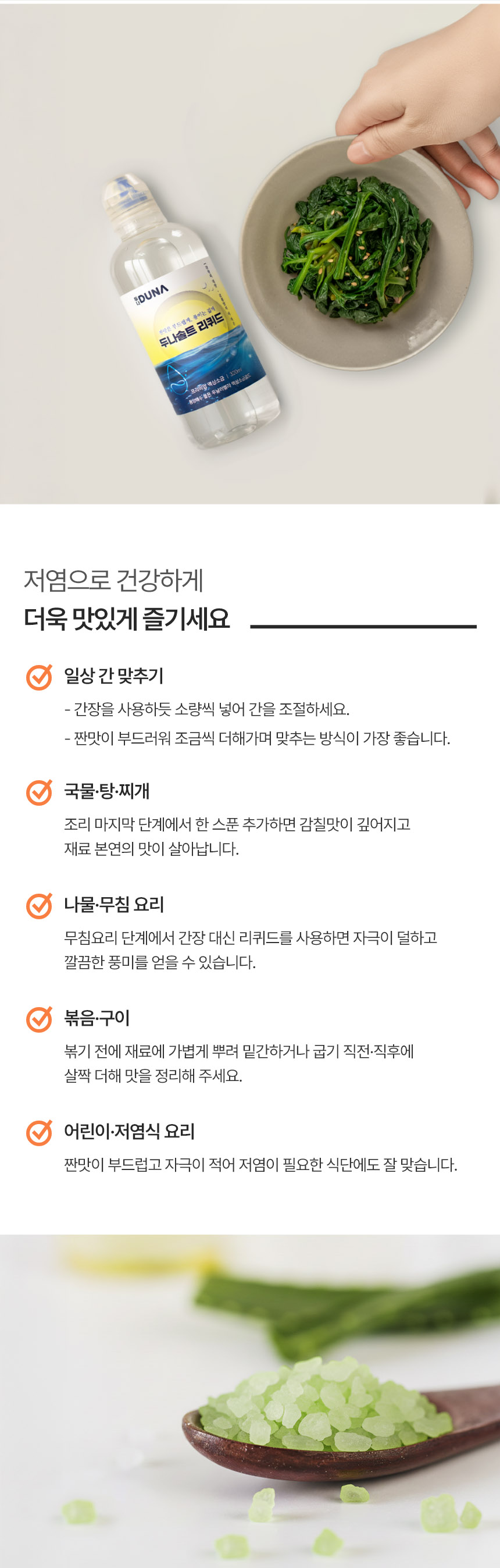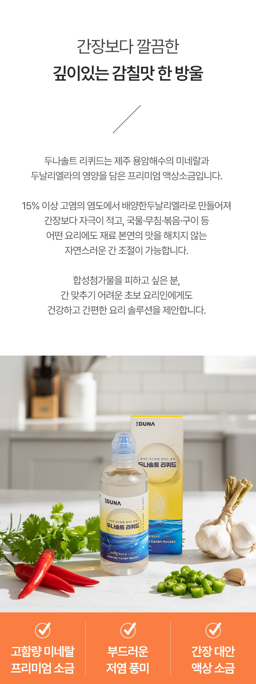 | 소비자안전을 위한 주의사항 | 직사광선을 피하고 건조하고 서늘한 곳에 보관해주세요. 두날리에알 액상소금의 경우, 두날리엘라가 침전되어 보일 수 있습니다. 이물질이 아니오니 안심하고 흔들어서 사용해주세요. 사용 후 용기는 반드시 밀봉하여 보관해 주세요. |