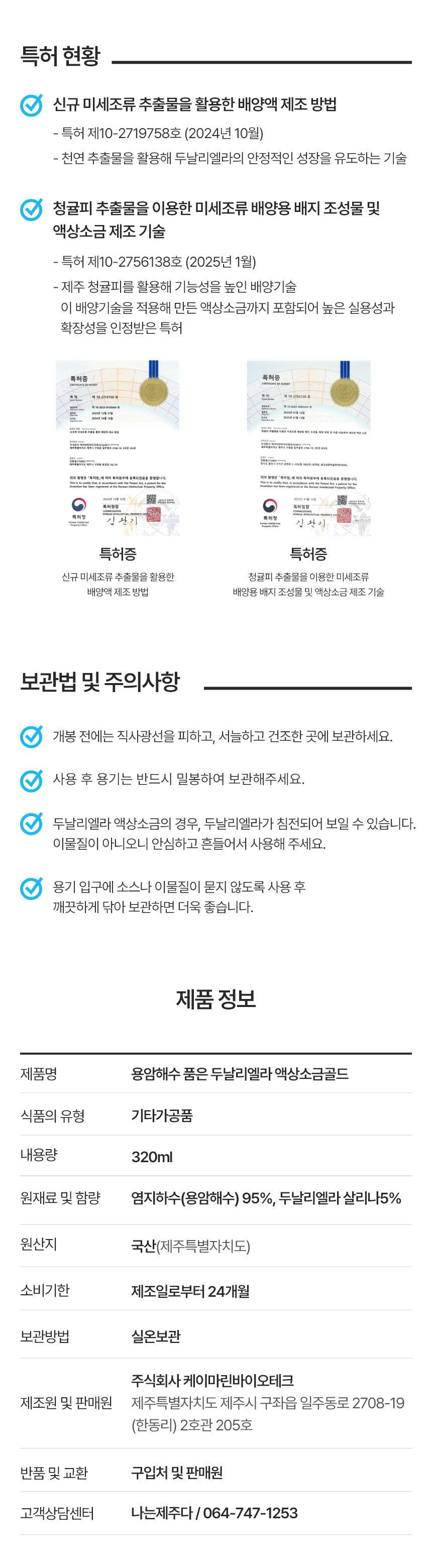 | 생산자 및 소재지 | (주)케이마린바이오테크 - 제주 구좌읍 일주동로 270819 용암해수센터 2호관 205호 |