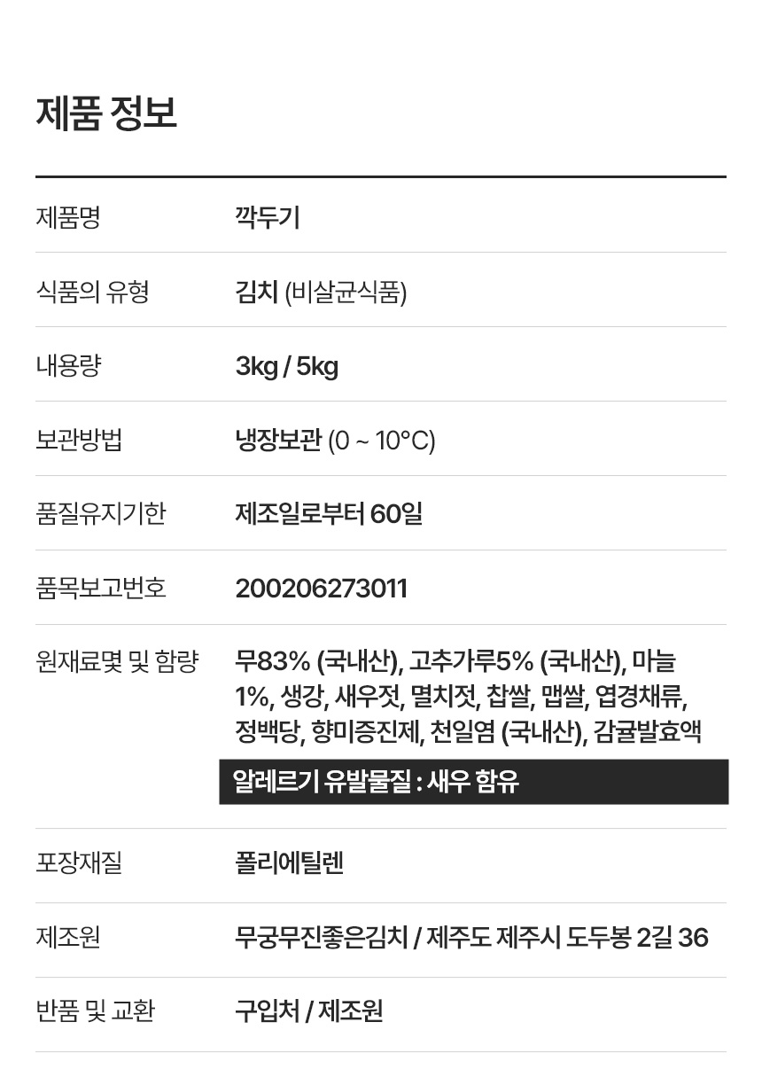 | 포장단위별 내용물의 용량(중량),수량 | 깍두기 3kg,5kg/1box |