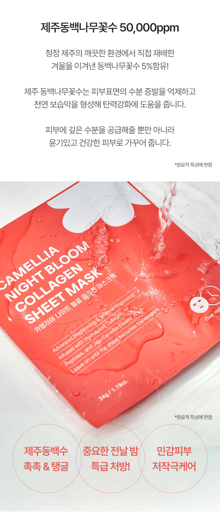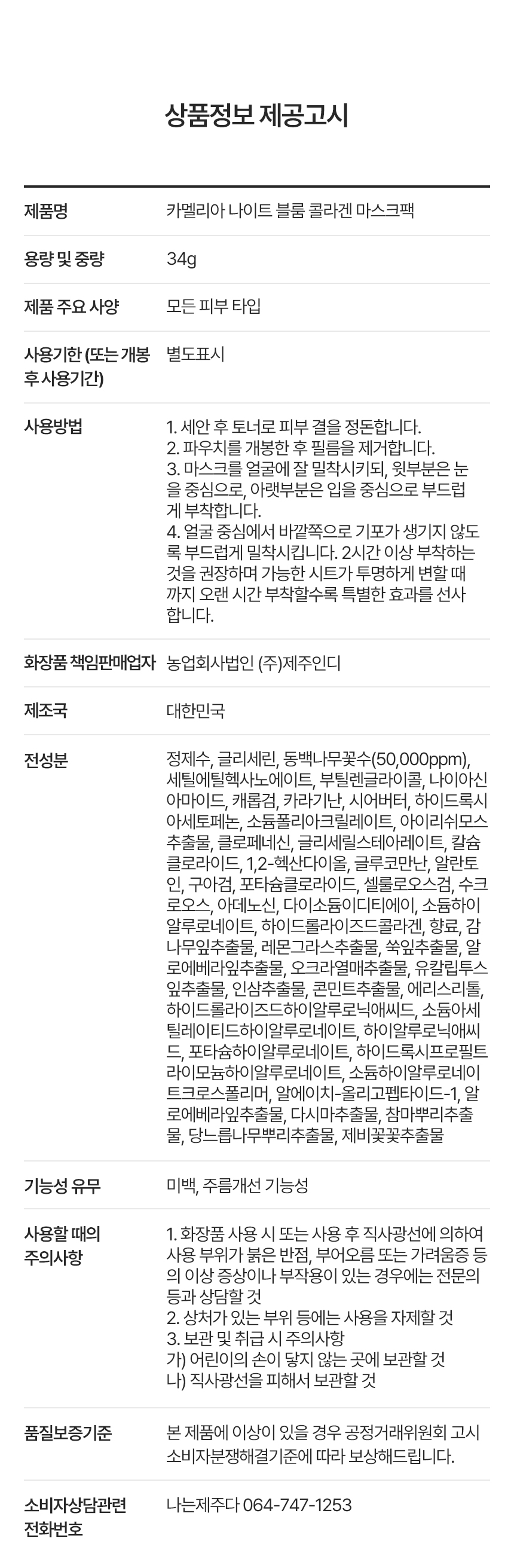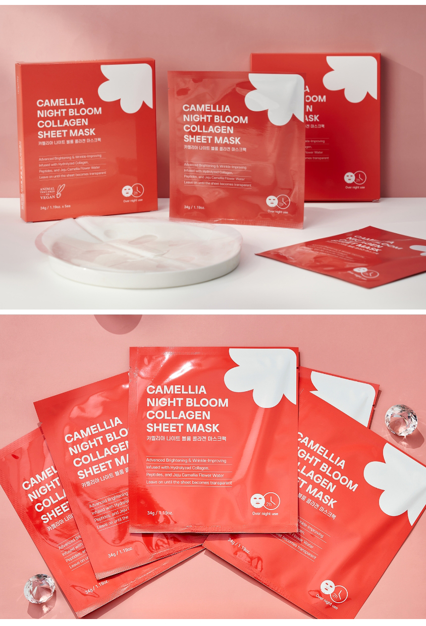 | 용량 또는 중량 | 카멜리아 나이트 블룸 콜라겐 마스크팩 1개당 34g |