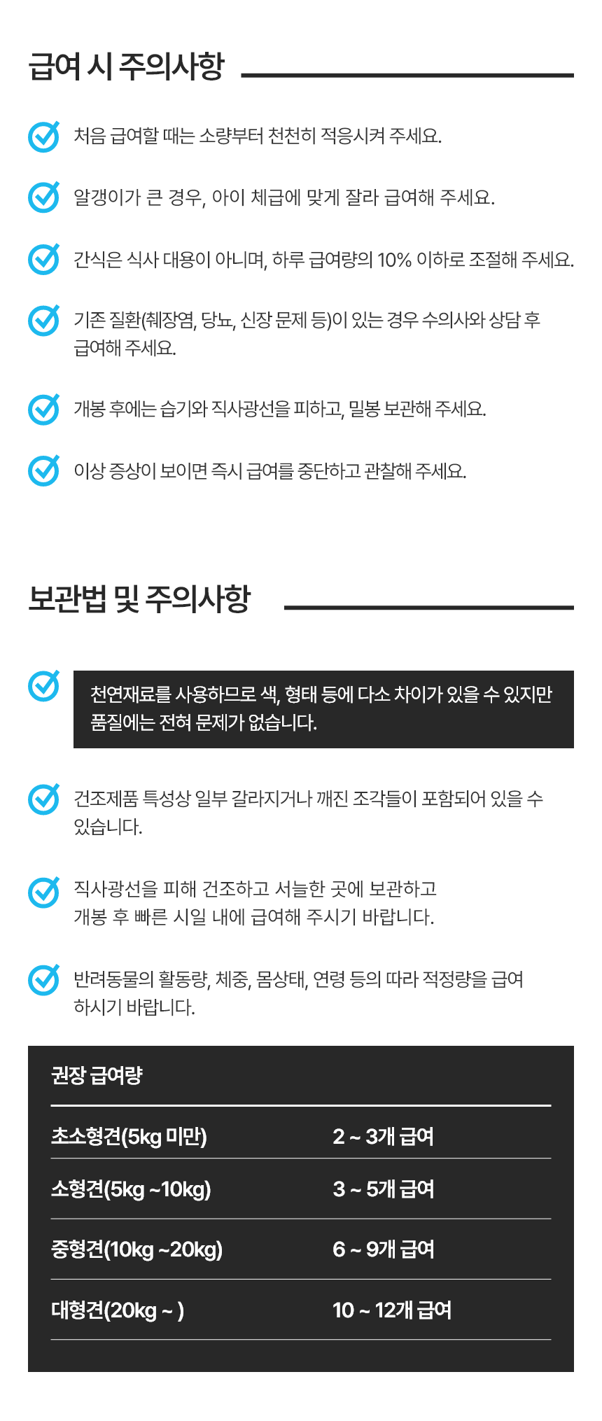 | 사용상 주의사항 | 생후 3개월 이후의 강아지부터 급여 가능하며 건조한 동결건조 제품 특성상 급여 시 수분 섭취가 반드시 필요하며 급여량은 반려견의 체중 연령 건강 운동량에 따라 차이가 날 수 있습니다. |