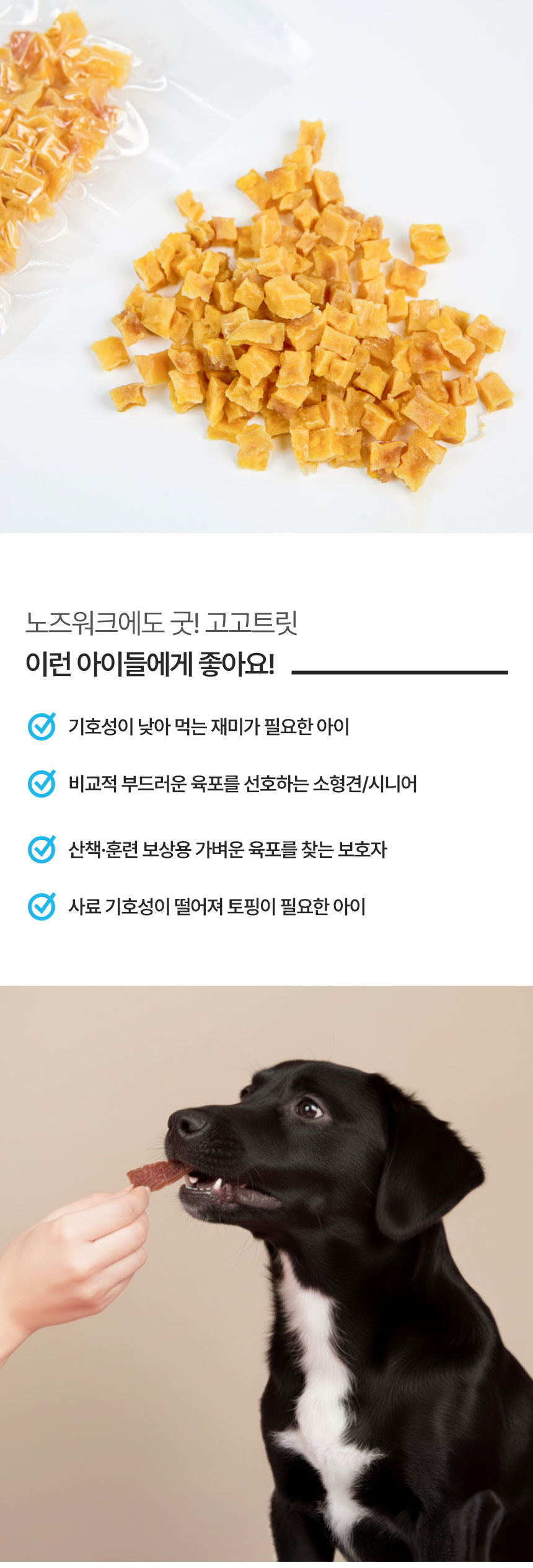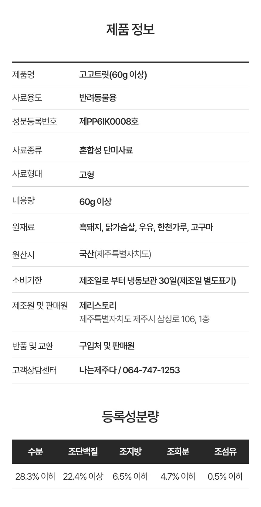 | 사용상 주의사항 | 1) 3개월 미만의 반려견에게는 급여하지 마세요. 2) 특정 원료에 알레르기가 있는 반려견의 원재료를 반드시 확인해 주세요. 처음먹는 간식의 경우 소량만 급여 후 상태를 확인해 주세요. 3) 차가운 상태의 간식 급여는 구토나 설사를 유발 할 수 있으니 해동 후 급여해주세요. 4) 급하게 먹는 아이나 딱딱한 간식은 급여시 지켜봐주세요. 치아파절 및 급하게 삼키는 것을 주의해주세요. 5) 과다 급여시 구토 및 설사를 유발할 수 있어요. 하루 사료량의 10%로만 급여해주세요. (연령 및 활동량에 따라 조절) 6) 반려동물 외 급여급지 |