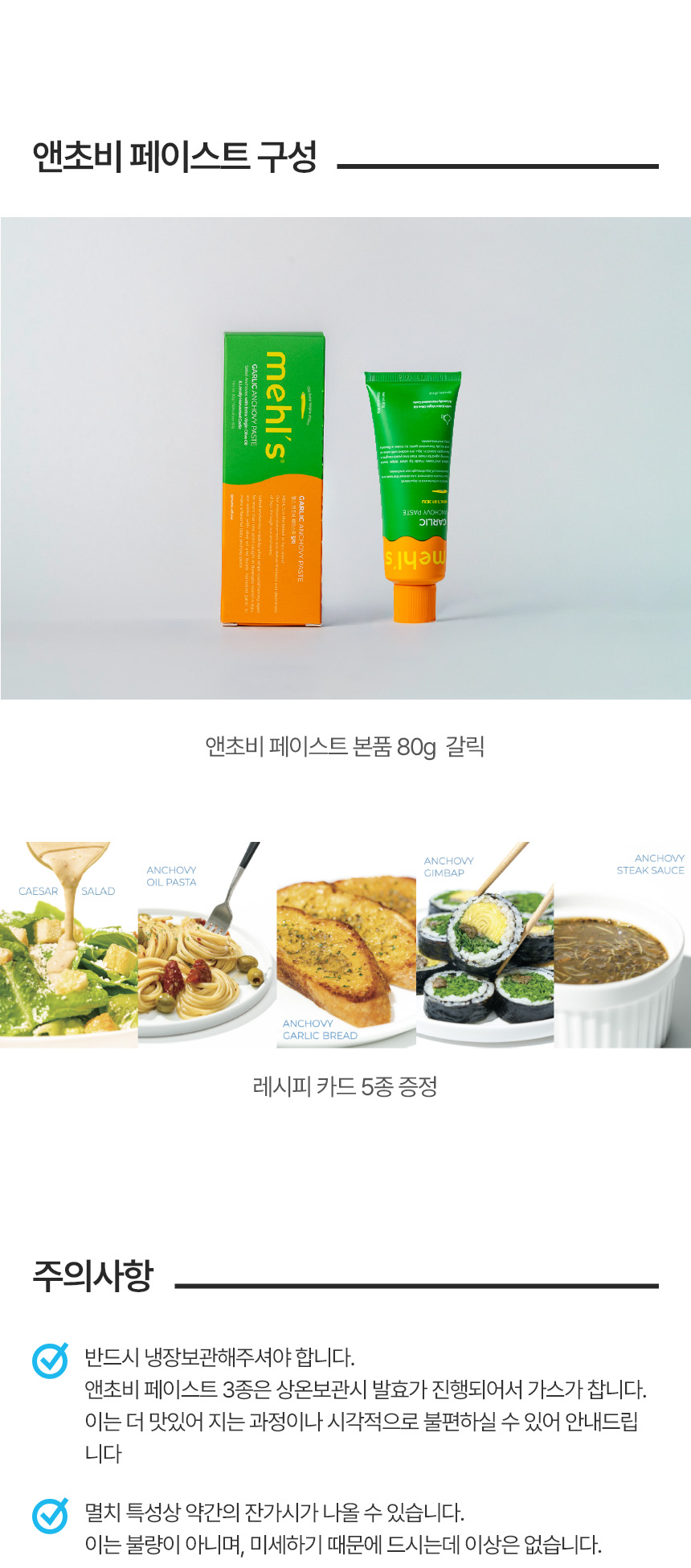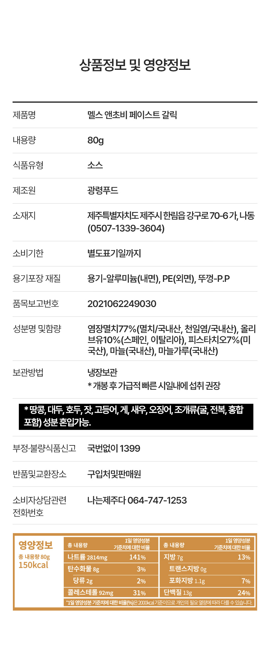 | 원재료명 및 함량 | 염장멸치77%(멸치/국내산, 천일염/국내산), 올리브유 10%(스페인, 이탈리아), 피스타치오7%(미국산), 마늘(국내산), 마늘가루(국내산) |