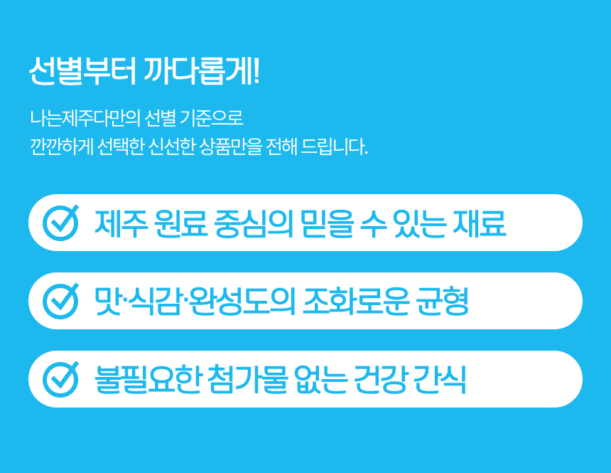 나는제주다는 「전자상거래 등에서의 소비자보호에 관한 법률」 및 공정거래위원회 소비자분쟁해결기준을 준수합니다. 상품별 상세 안내는 각 상품 상세페이지 내 배송·교환·환불 안내를 확인해 주시기 바랍니다.