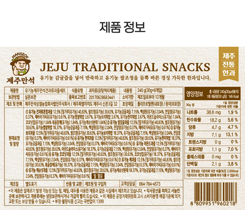 | 포장단위별 내용물의 용량(중량),수량 | 유기농 제주만석 견과류 감귤과즐 (30g X 8) 1box 선물세트 |