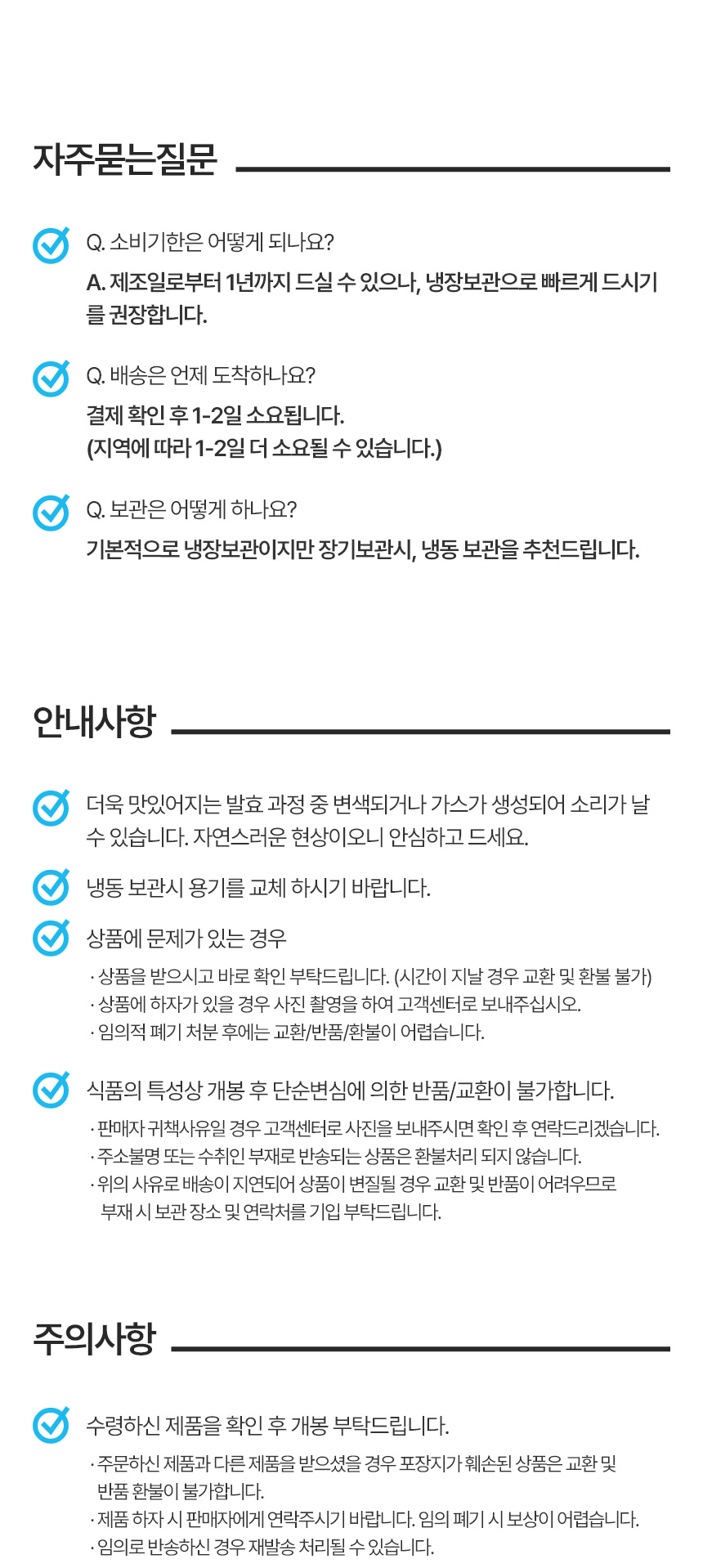- 단순 변심, 개인적인 입맛 차이, 보관 부주의등 구매자 귀책 사유는 교환·반품 대상에 해당하지 않습니다.