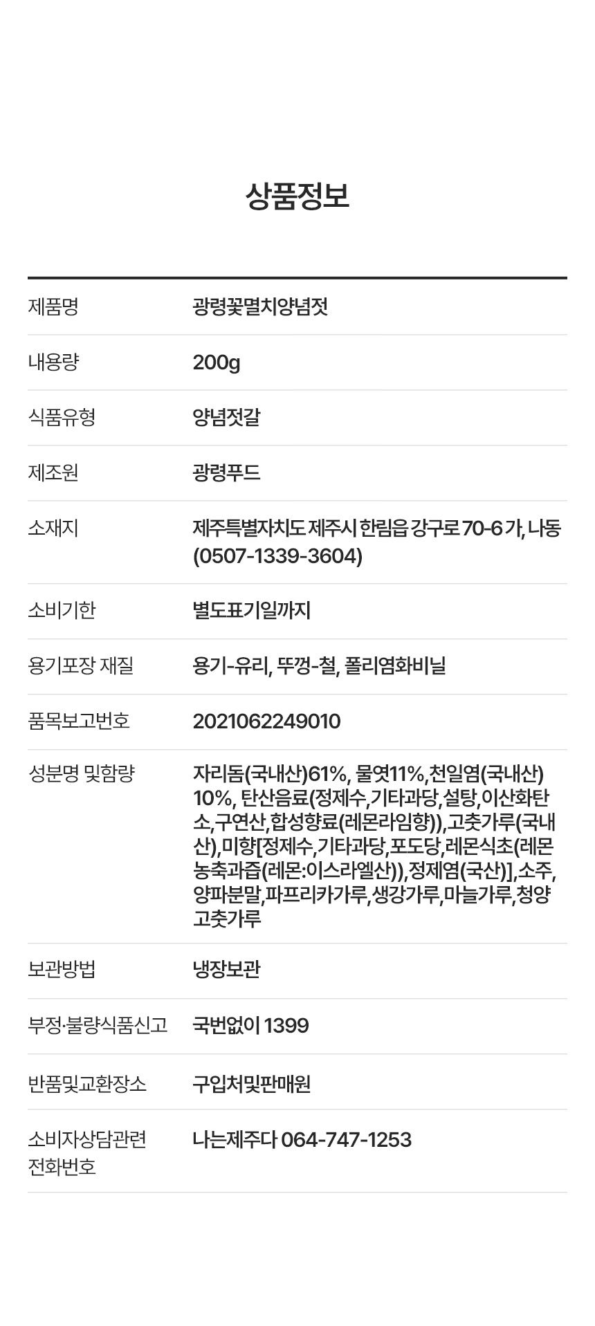 | 생산자 및 소재지 | 광령푸드 - 제주특별자치도 제주시 한림읍 강구로 70-2 |