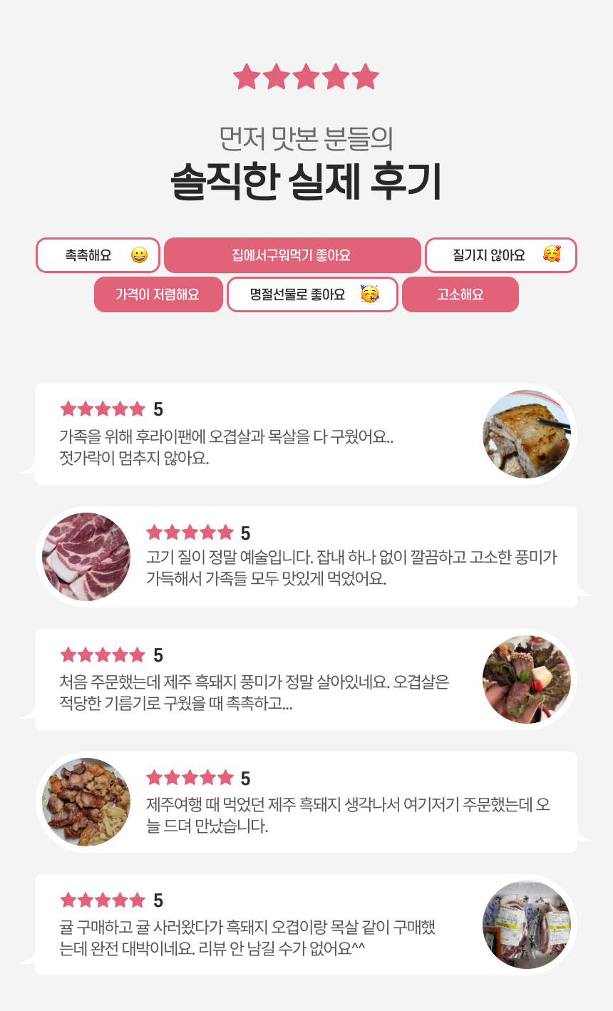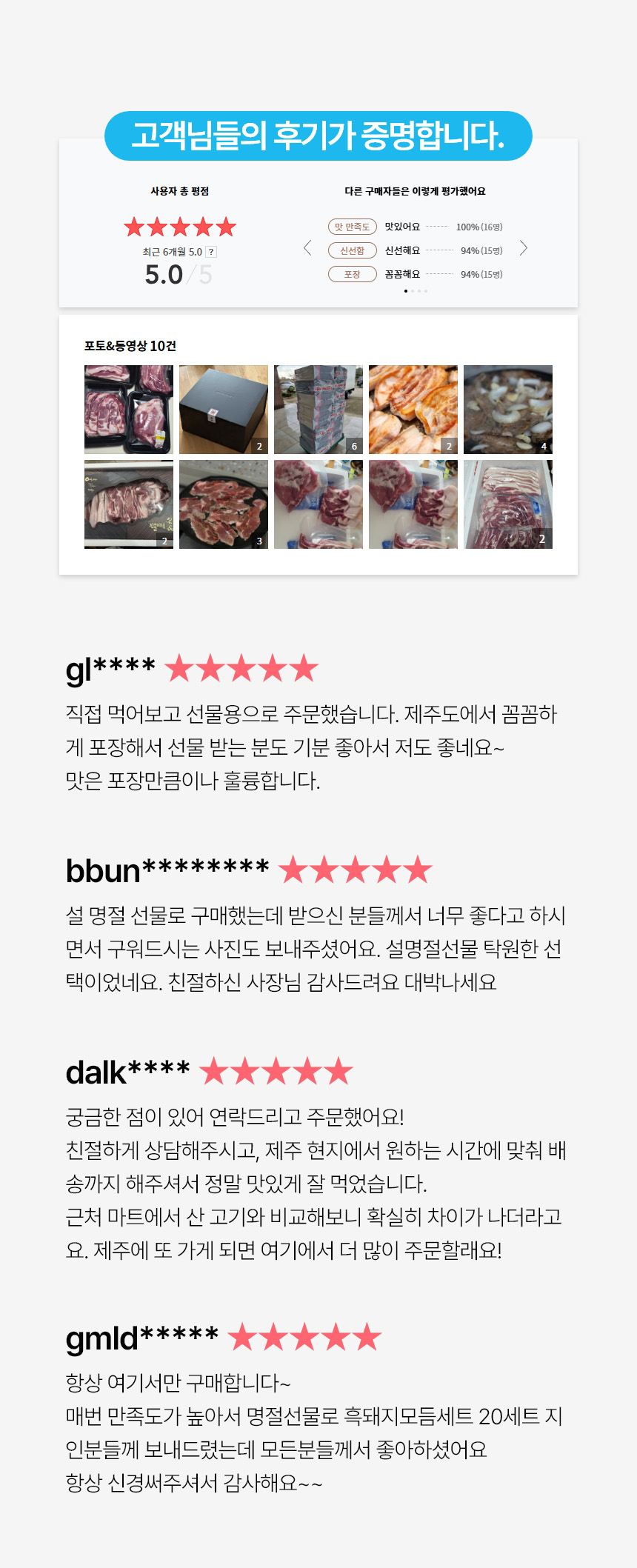 | 상품구성 | 선택1>흑돈구이용 선물세트 ( 흑돈오겹500g*2ea 흑돈목심500g*2ea),선택2>흑돈모듬선물세트 (흑돈오겹구이용500g 흑돈목심구이용500g 흑돈앞다리살수육용500g 흑돈우대갈비구이용 500g) |