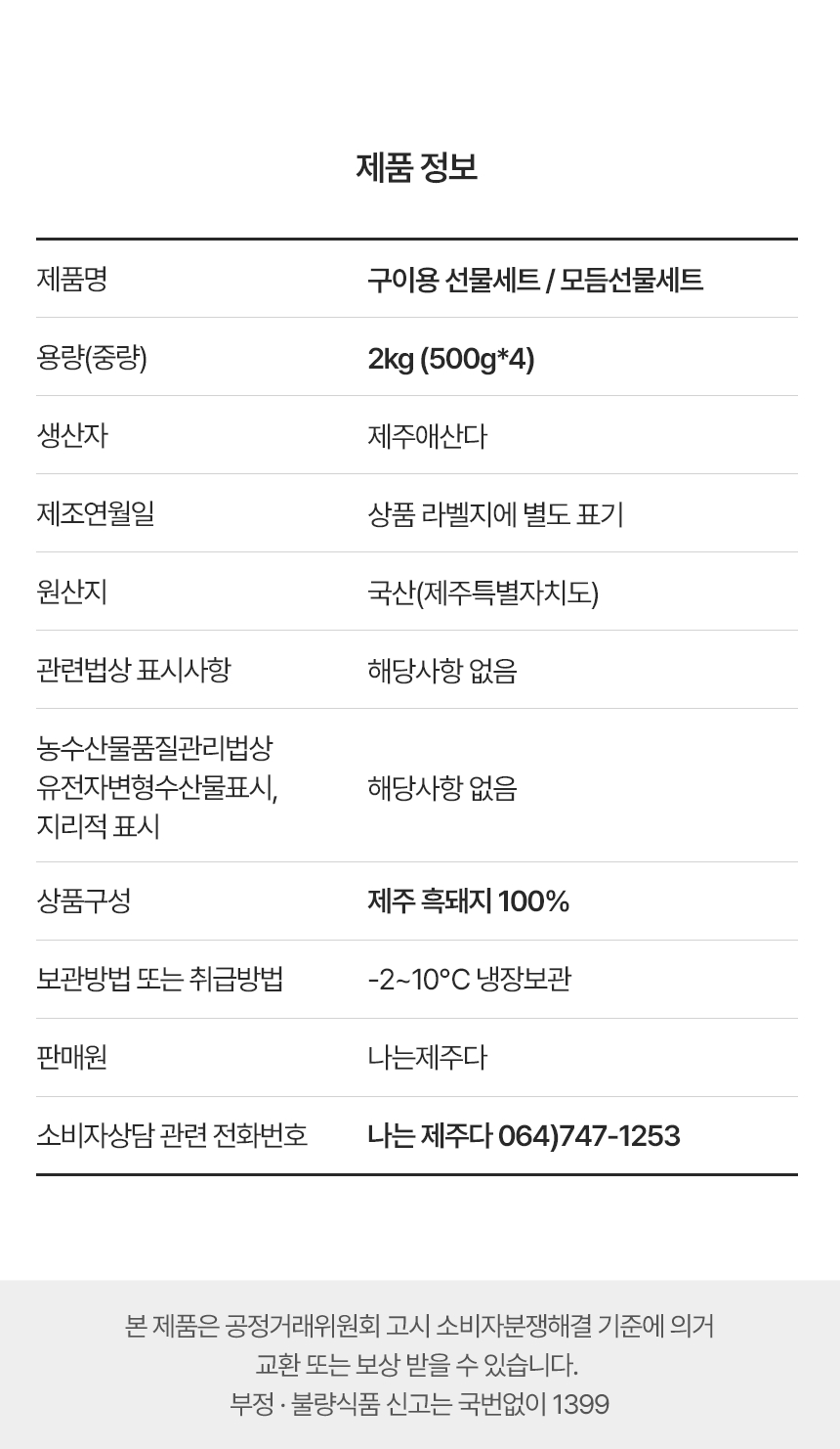 | 포장단위별 내용물의 용량(중량),수량,크기 | 선택1>흑돈구이용 선물세트 ( 흑돈오겹500g*2ea 흑돈목심500g*2ea),선택2>흑돈모듬선물세트 (흑돈오겹구이용500g 흑돈목심구이용500g 흑돈앞다리살수육용500g 흑돈우대갈비구이용 500g) |