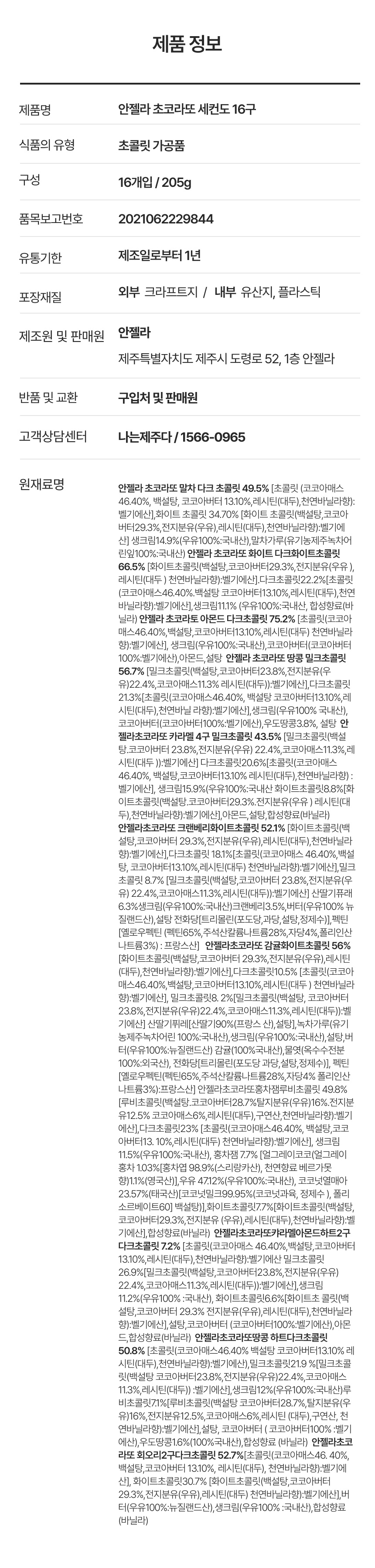 | 포장단위별 내용물의 용량(중량),수량 | 안젤라 초코라또 세컨도 16개입 1box, 205g |