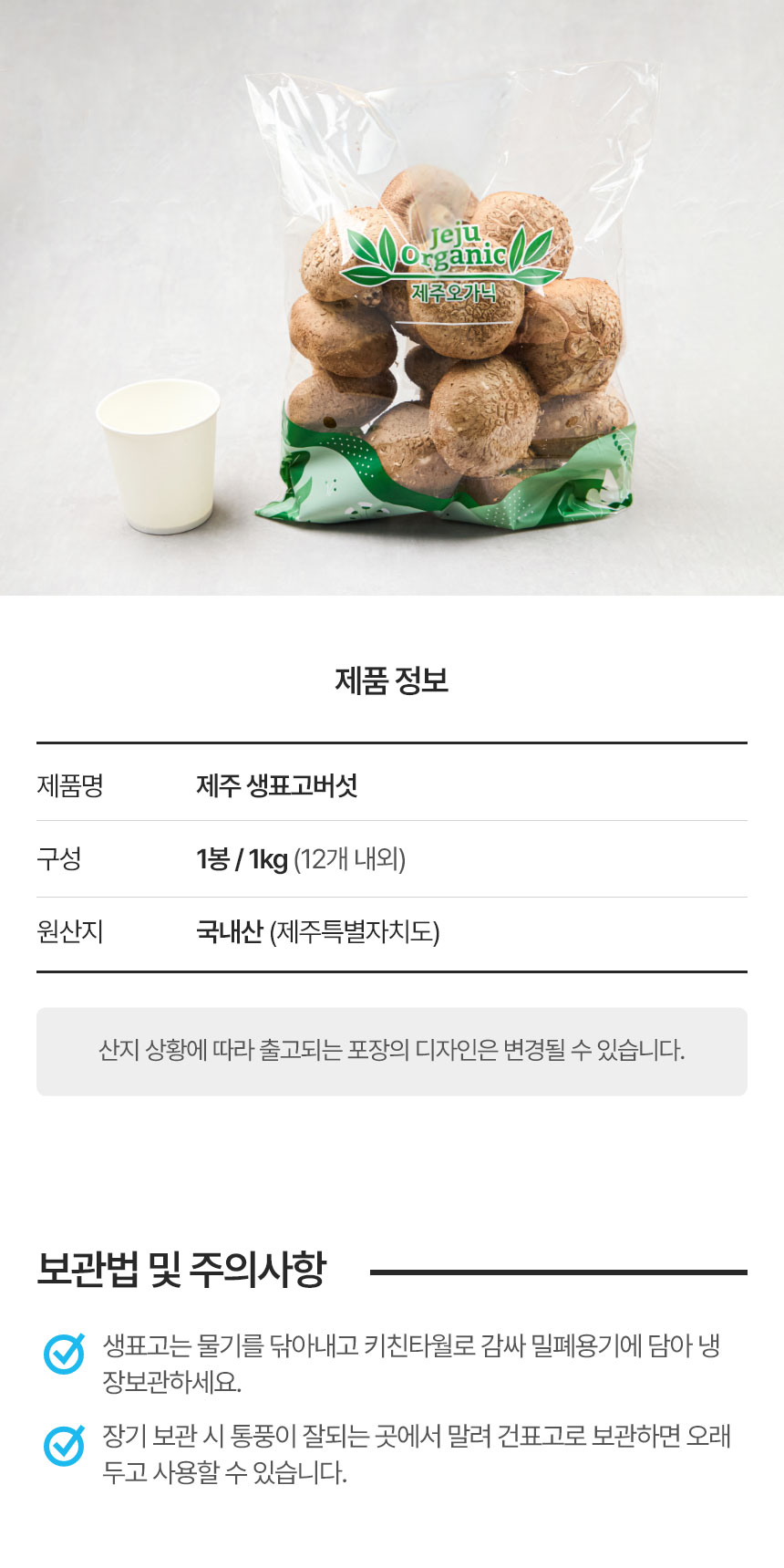 | 포장단위별 내용물의 용량(중량),수량,크기 | 제주 생표고 1kg/1box/신선제품은 중량으로 표기하므로 크기를 표시하지 않습니다. |