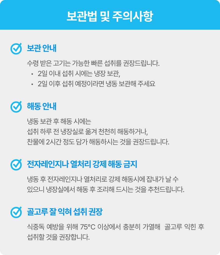 | 보관방법 또는 취급방법 | 2일이내 섭취시 냉장보관 / 2일이후 섭취시 냉동보관 |
