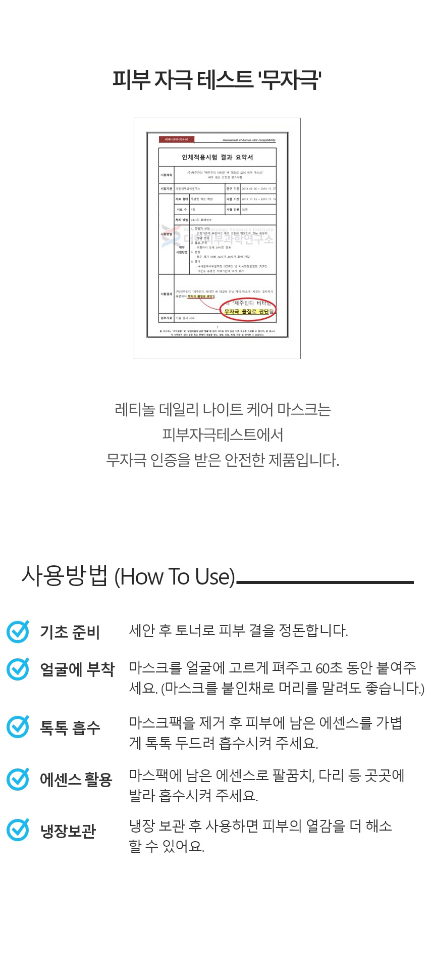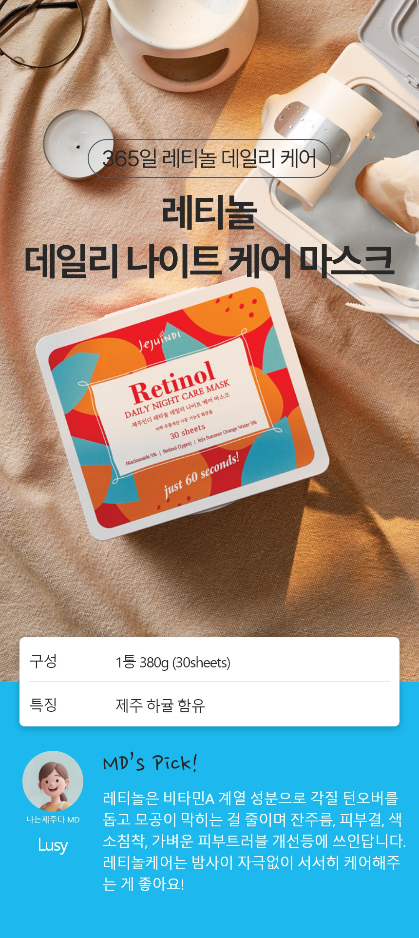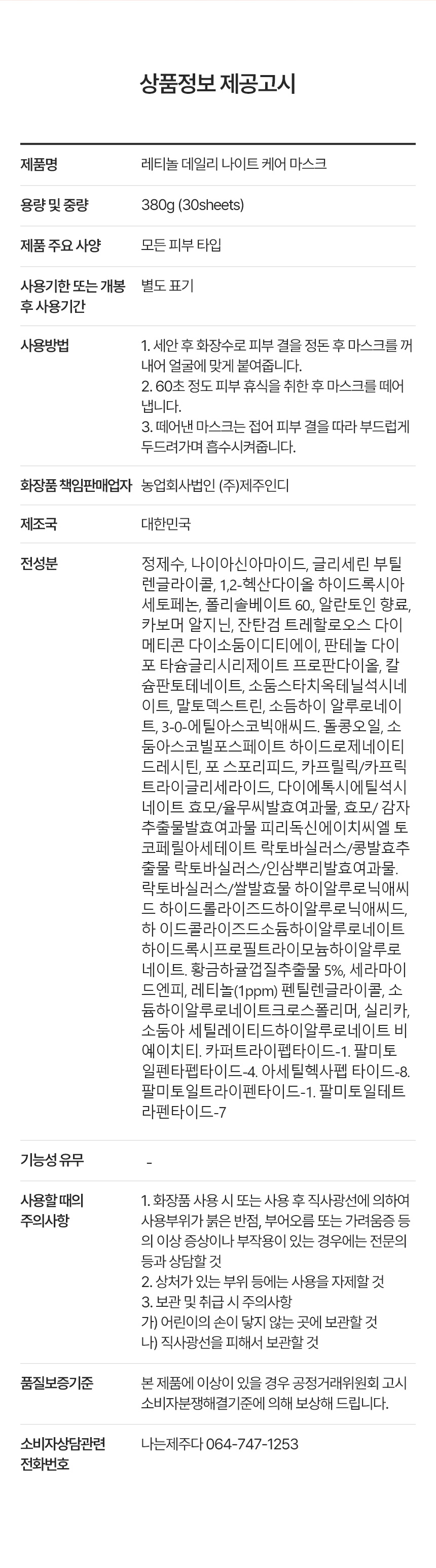 | 용량 또는 중량 | 레티놀 데일리 나이트 케어 마스크 380g(30시트) |