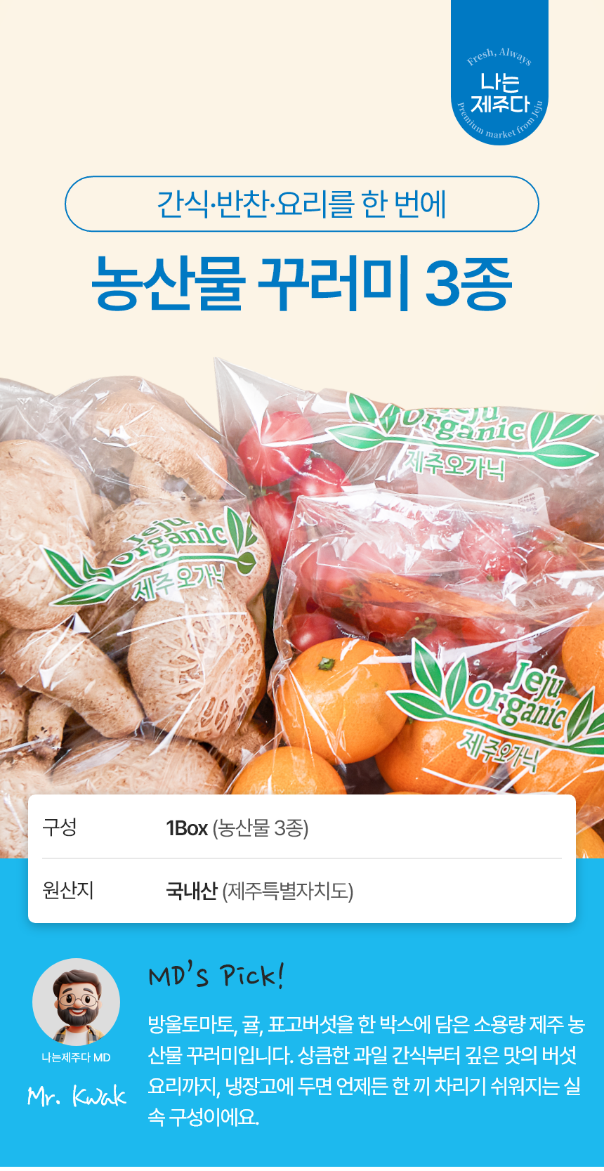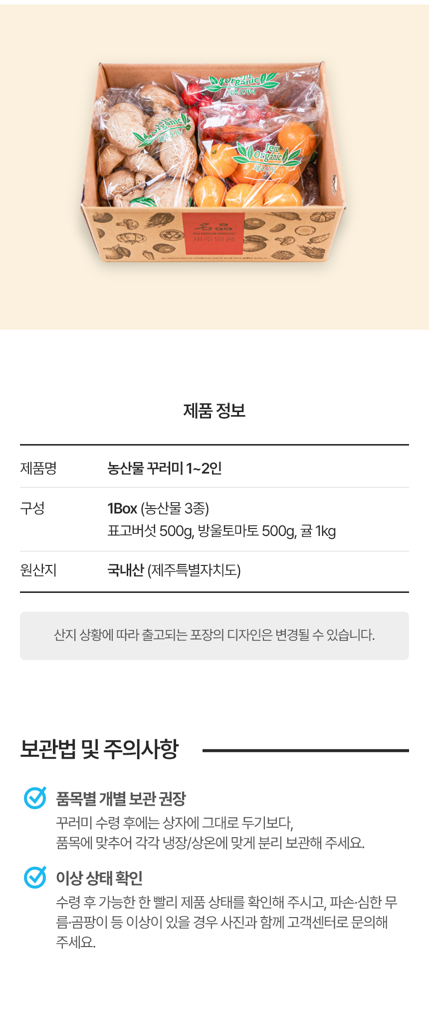 | 포장단위별 내용물의 용량(중량),수량,크기 | 생표고버섯500g, 방울토마토500g, 귤1kg |