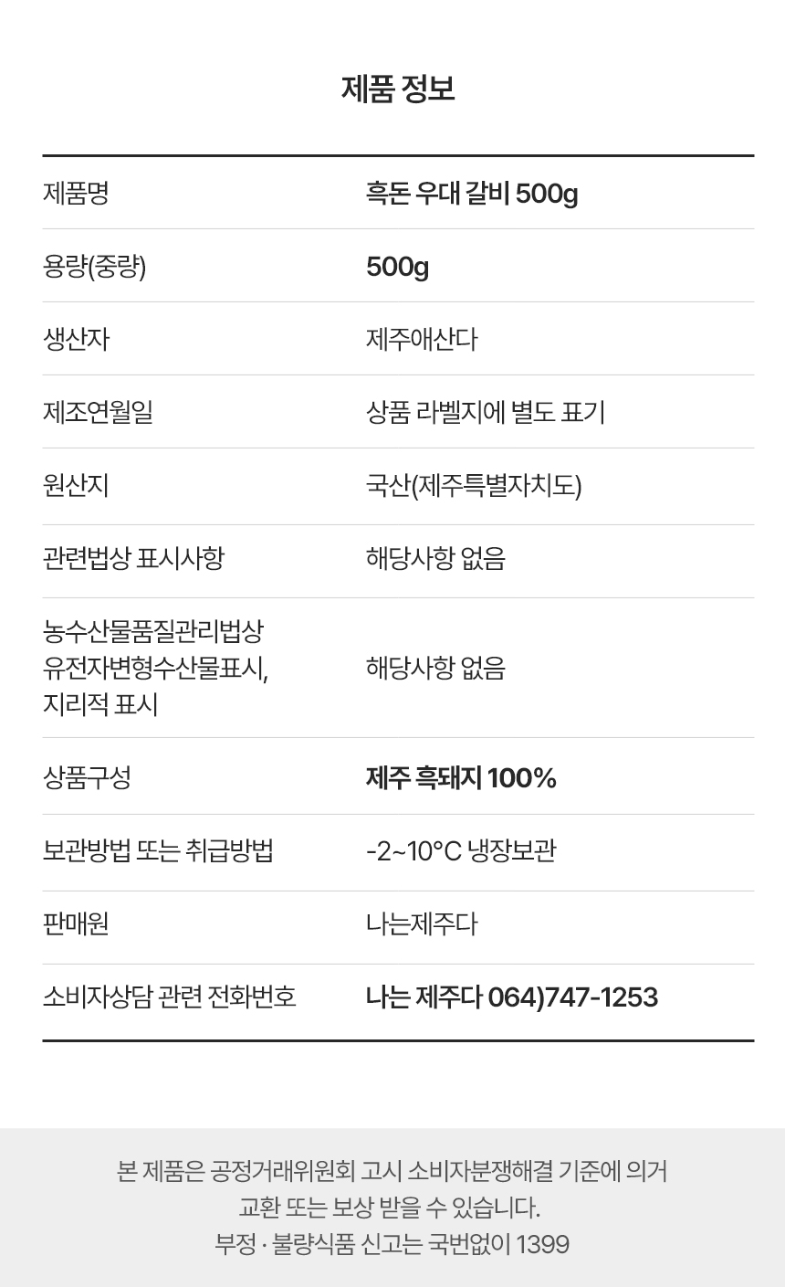 | 품목 또는 명칭 | 흑돈 우대 갈비 500g |