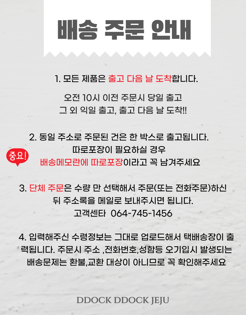 3. 동일 주소로 주문된 모든 건은 한 박스에 포장되어 배송됩니다. 따로 포장이 필요하신 경우는 배송메세지란에 따로배송이라고 남겨주세요