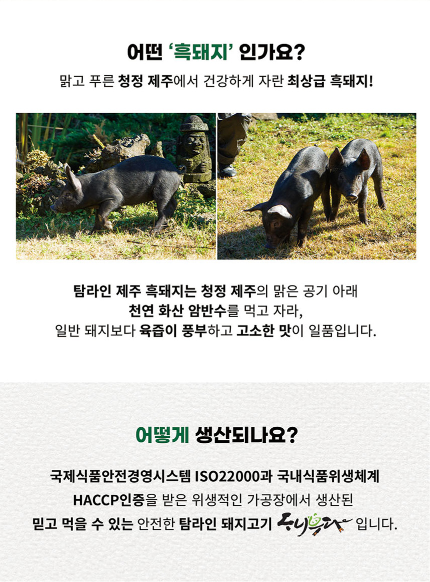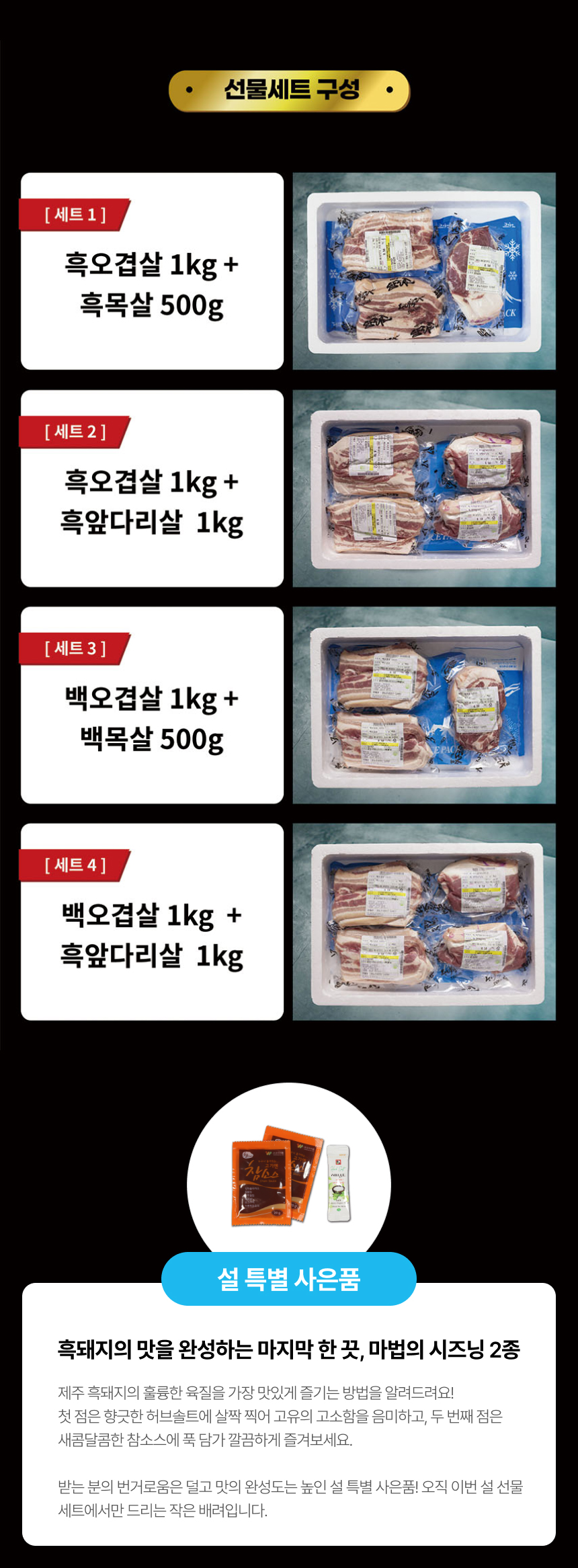 | 상품구성 | 선물세트 1> 흑오겹살1kg + 흑목살 500g,선물세트 2> 흑오겹살1kg + 흑앞다리살 1kg,선물세트 3> 백오겹살1kg + 백목살 500g,선물세트 4> 백오겹살1kg + 흑앞다리살 1kg |