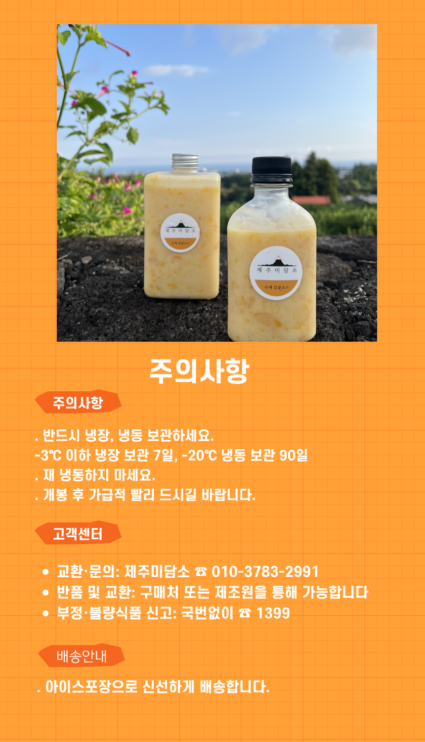 제주미담소 감귤소스는 신선식품으로 고객님의 단순변심이나 수치거부에 의한 환불 및 교환은 불가합니다.