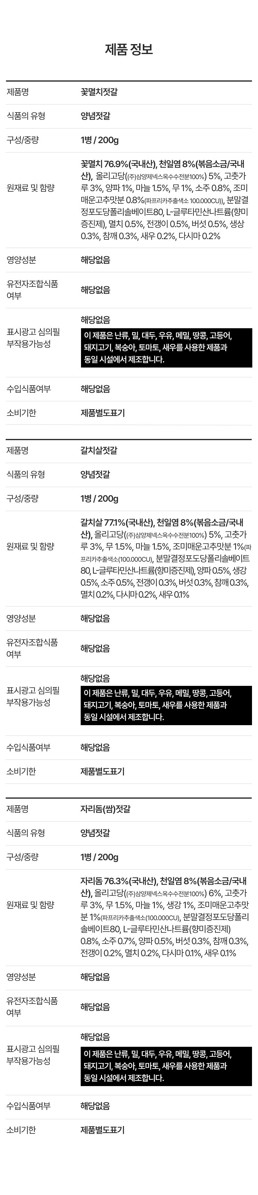 | 원재료명 및 함량 | 갈치살젓갈[갈치살 77.1%(국내산), 천일염 8%(붉은소금/국내산),올리고당 5%(물엿)·액젓(멸치)·오수수전분 100%), 고춧가루 3%, 무 1.5%, 마늘 1.5%, 조미매운고추맛분말 1% (포도과즙추출색소(100,000CU), 분말결정포도당·폴리글리세린E80, L-글루타민산나트륨(향미증진제)), 양파 0.5%, 생강 0.5%, 소주 0.5%, 전갱이 0.3%, 버섯 0.3%, 참깨 0.3%, 멸치 0.2%, 다시마 0.2%, 새우 0.1%] 자리돔(쌈)젓갈[자리돔젓갈 76.3%(국내산), 천일염 8%(붉은소금/국내산) ,올리고당 6%(물엿)·액젓(멸치)·오수수전분 100%), 고춧가루 3%, 무 1.5%, 마늘 1%, 생강 1%, 조미매운고추맛분말 0.8%(포도과즙추출색소(100,000CU), 분말결정포도당·폴리글리세린E80, L-글루타민산나트륨(향미증진제)) ,소주 0.7%, 양파 0.5%, 버섯 0.3%, 참깨 0.3%, 전갱이0.2%, 멸치 0.2%, 다시마 0.1%, 새우 0.1%] 꽃멸치젓갈[꽃멸치 76.9%(국내산), 천일염 8%(붉은소금/국내산),올리고당 5%(물엿)·액젓(멸치)·오수수전분 100%), 고춧가루 3%, 양파 1%, 마늘 1%, 무우 1%, 소주 0.8%, 조미매운고추맛분말 0.8%(포도과즙추출색소(100,000CU), 분말결정포도당·폴리글리세린E80, L-글루타민산나트륨(향미증진제)), 멸치 0.5%, 전갱이 0.5%, 버섯 0.5%, 청경 0.3%, 참깨 0.3%, 새우 0.2%, 다시마 0.2%] |