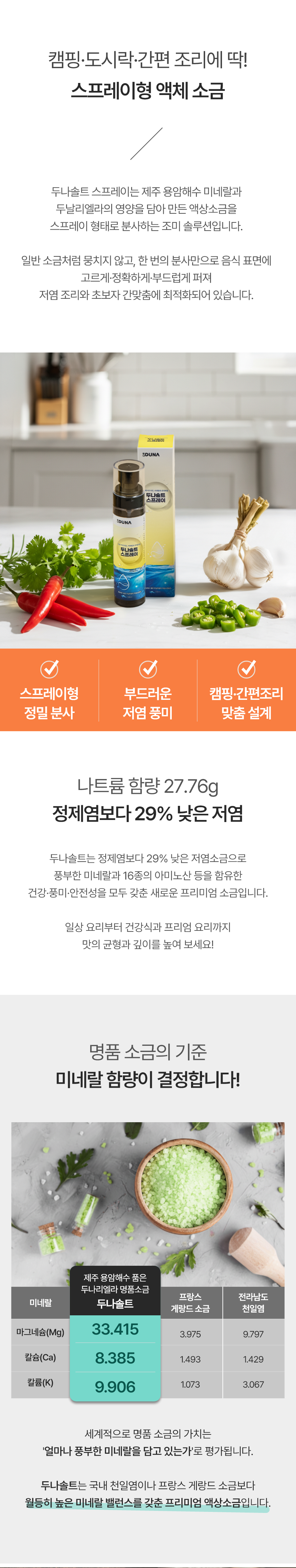 | 소비자안전을 위한 주의사항 | 직사광선을 피하고 건조하고 서늘한 곳에 보관해 주세요. 두날리엘라 액상소금의 경우, 두날리엘라가 침전되어 보일 수 있습니다. 이물질이 아니오니 안심하고 흔들어서 사용해 주세요. 본 제품은 공정거래위원회 고시 '소비자분쟁해결기준'에 의거 교환 또는 보상 받을 수 있습니다. 부정·불량식품 신고는 국번없이 1399 |