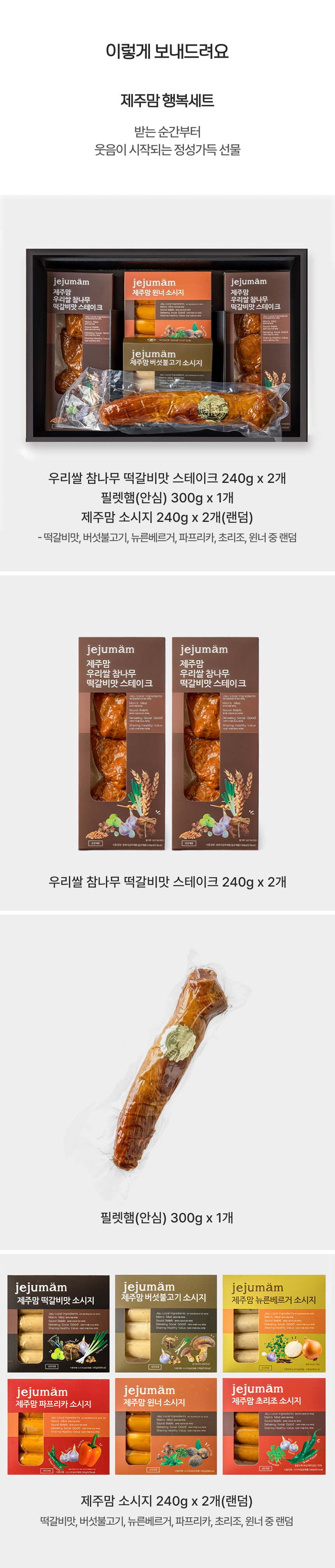 | 포장단위별 내용물의 용량(중량),수량 | 떡갈비맛 스테이크 240g 2개, 필렛햄(안심)300g 1개, 흑돼지소시지 240g 2개 |