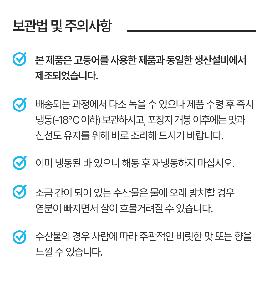 | 보관방법 또는 취급방법 | -18℃ 이하 냉동보관(해동 후 재냉동 금지) |