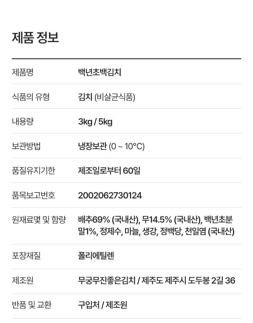 | 포장단위별 내용물의 용량(중량),수량 | 백년초백김치 3kg,5kg/1box |
