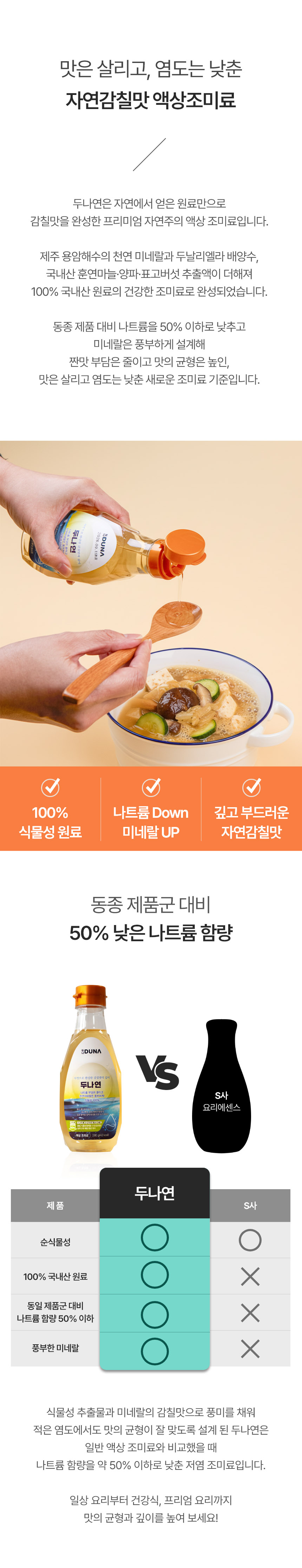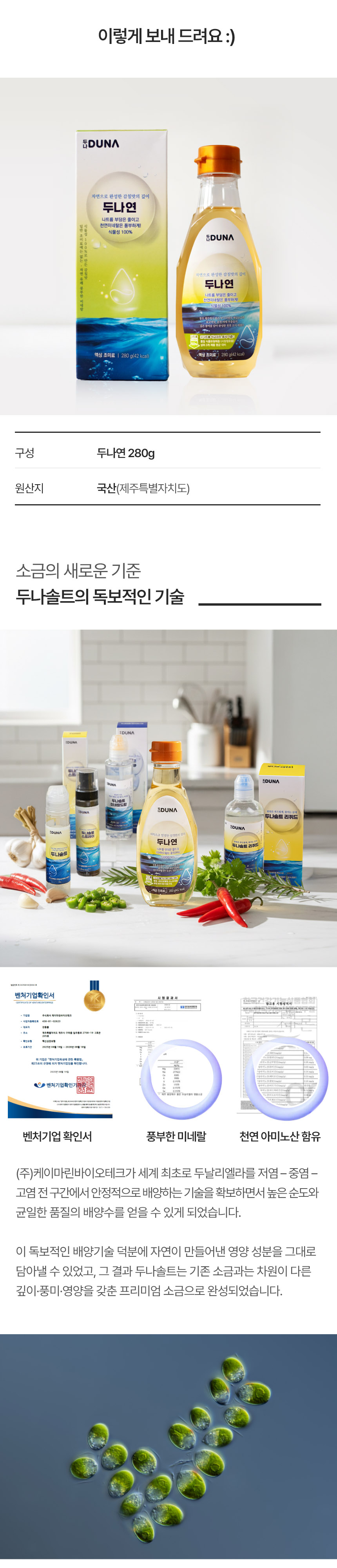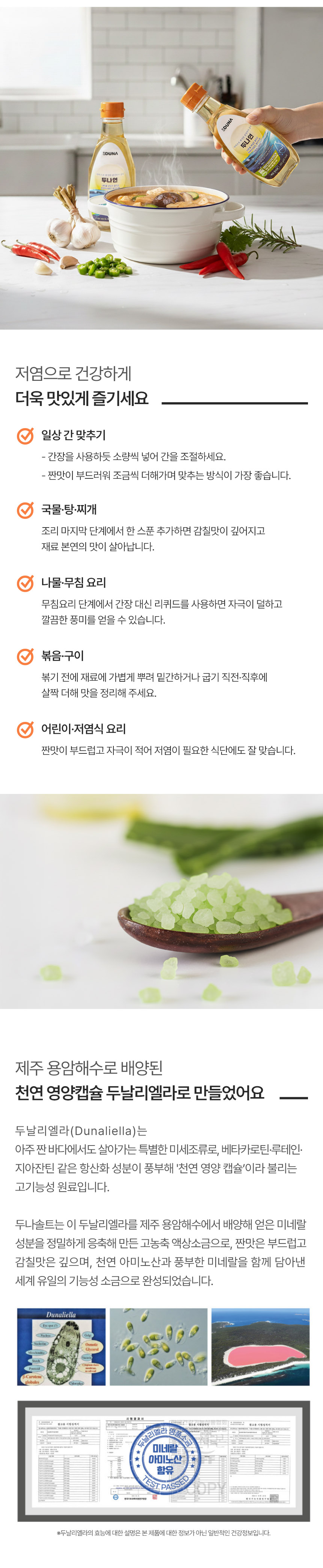 | 원재료명 및 함량 | 용암해수 품은 두날리엘라 액상소금골드[염지하수(용암해수)(제주산), 두날리엘라살리나(제주산)], 훈연야채추출액EX[훈연야채추출액DW(훈연마늘(마늘:국산), 훈연양파(양파:국산)], 정제소금[해수(국산), 천연염(호주산)], 훈연표고버섯추출액Ex |
